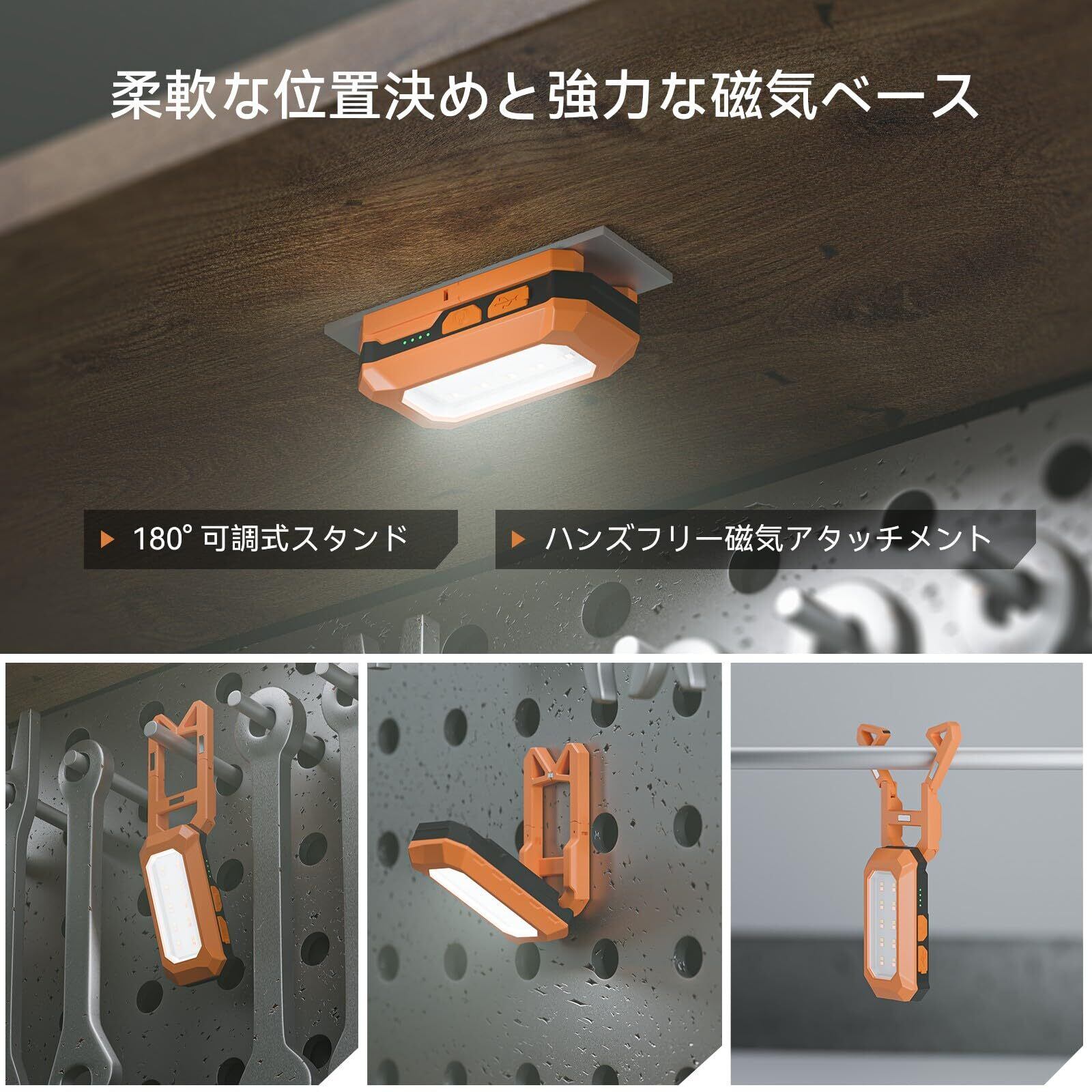 【多用途で便利な作業灯!工夫された充電式ワークライト!】 : この「作業灯」は、500ルーメンの明るさを誇るLEDライトで、充電式で様々なシーンに対応します。マグネット付きなので金属製の表面にしっかりと固定でき、作業時に手を自由に使える優れたデザインです。