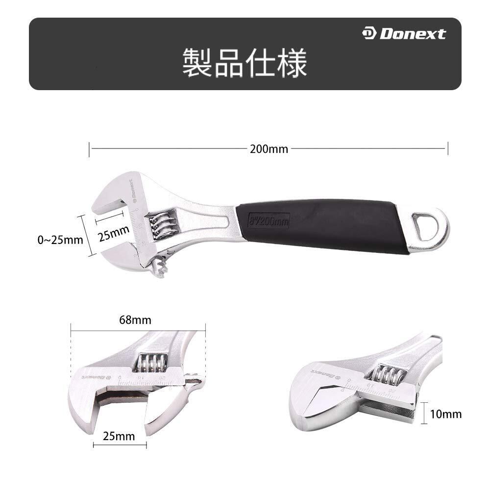 Donext モンキーレンチ 200mm 最大口開き25mm 目盛付 ゴムマット付 CR-V