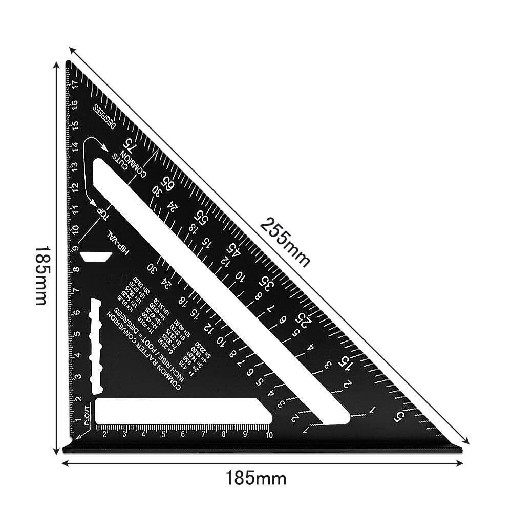 【便利な両面目盛り】 : 丸鋸ガイドとしても使用できるこの三角定規は、185mm×185mmのコンパクトなサイズで持ち運びも簡単です。片面は0-90度の目盛りが施されており、もう片面にはもう一つの目盛りがあり、さまざまな角度の測定に対応します。精密な作業をサポートし、DIY愛好者やプロフェッショナルの方々にもご満足いただけます。