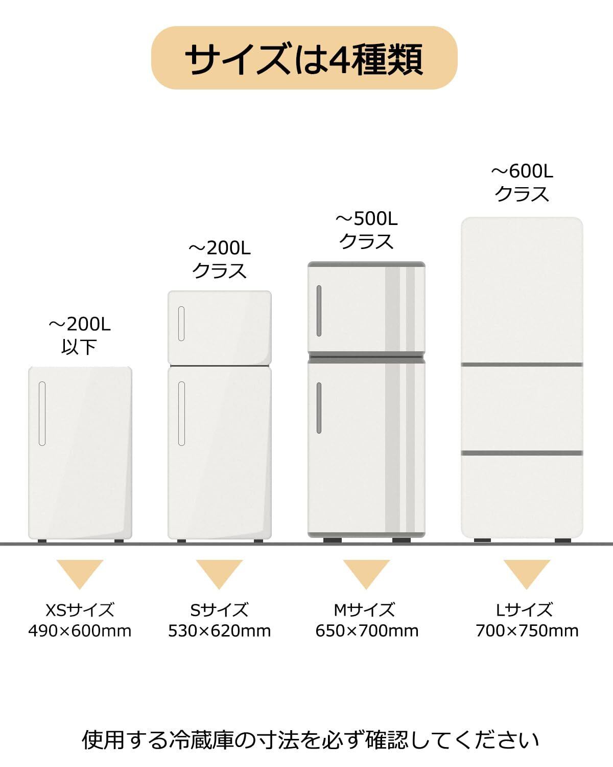 【注意事項】この冷蔵庫マットは4つのサイズがありますので、必ずご自身の冷蔵庫サイズを確認のうえお選びください。サイズの種類:XSサイズ49×60cm(200Lクラス以下の小型冷蔵庫対応)、Sサイズ53×62cm(200Lクラスの冷蔵庫対応)、Mサイズ65×70cm(500Lクラスの冷蔵庫対応)、Lサイズ70×75cm(最大600Lクラスの冷蔵庫対応)。