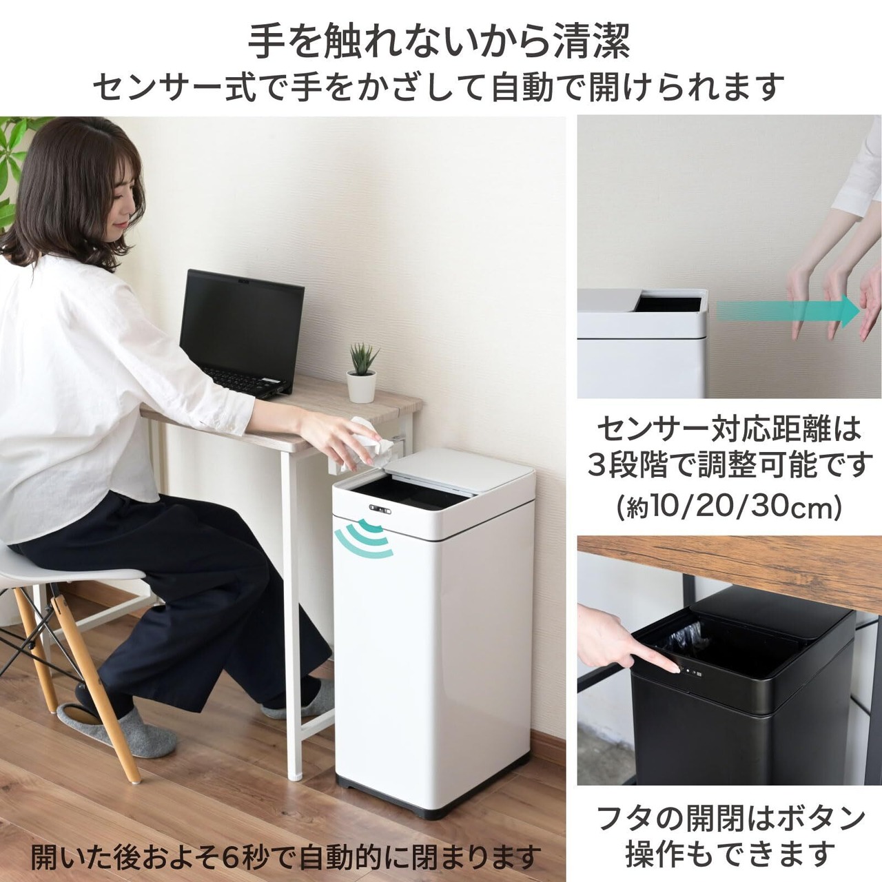 【便利な自動開閉】センサー式でフタに触らず開けられるので、お料理中にゴミを捨てたいときも清潔を保ったまま使えるゴミ箱です。約6秒後に自動でフタがしまります(センサー使用時)。