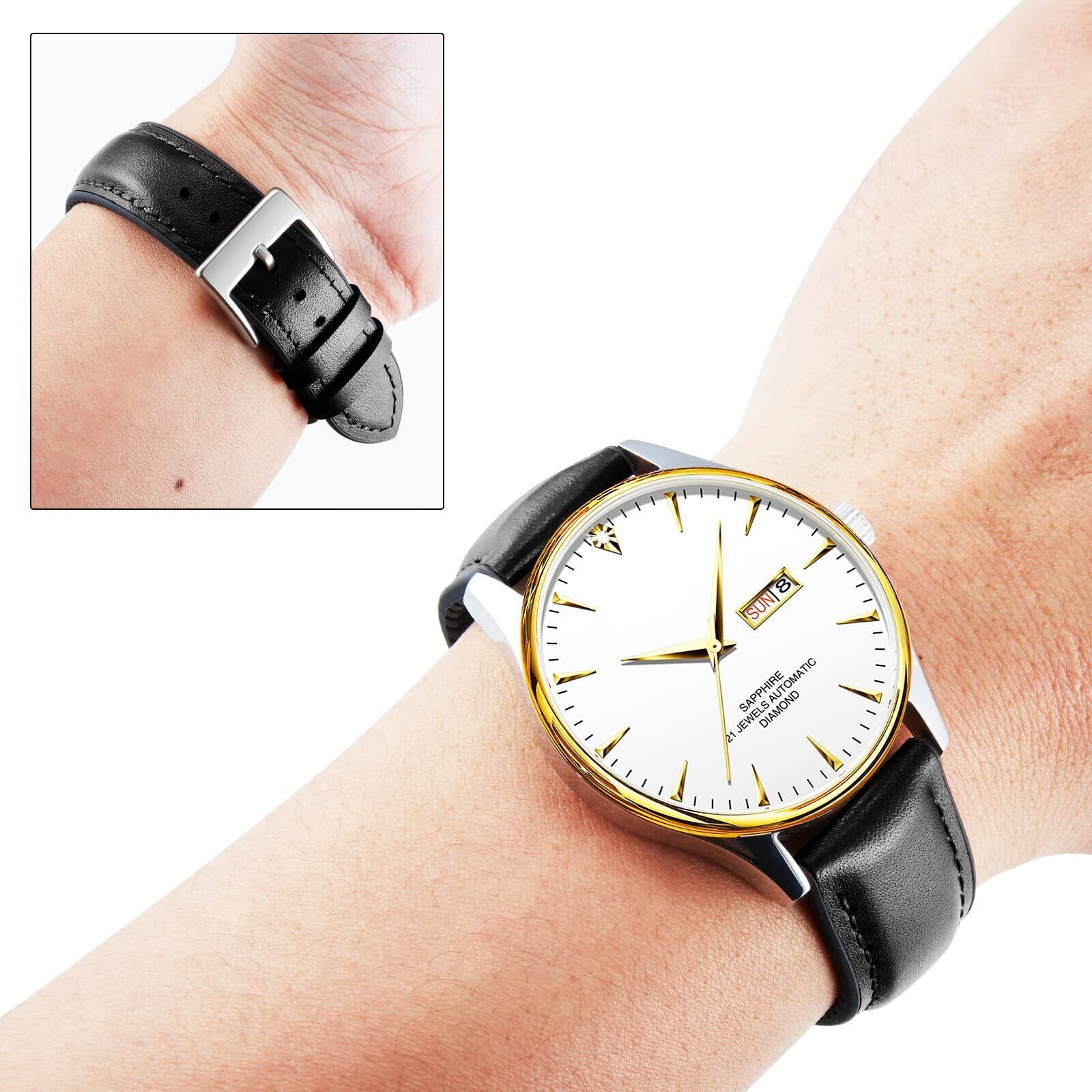 [BINLUN] レザー 時計バンド 内側のラバー 通気性 ハイブリッド クイックリリースウォッチベルト 腕時計ベルト スマートウォッチベルト 男女通用 (ブラック,21mm,シルバーバックル)