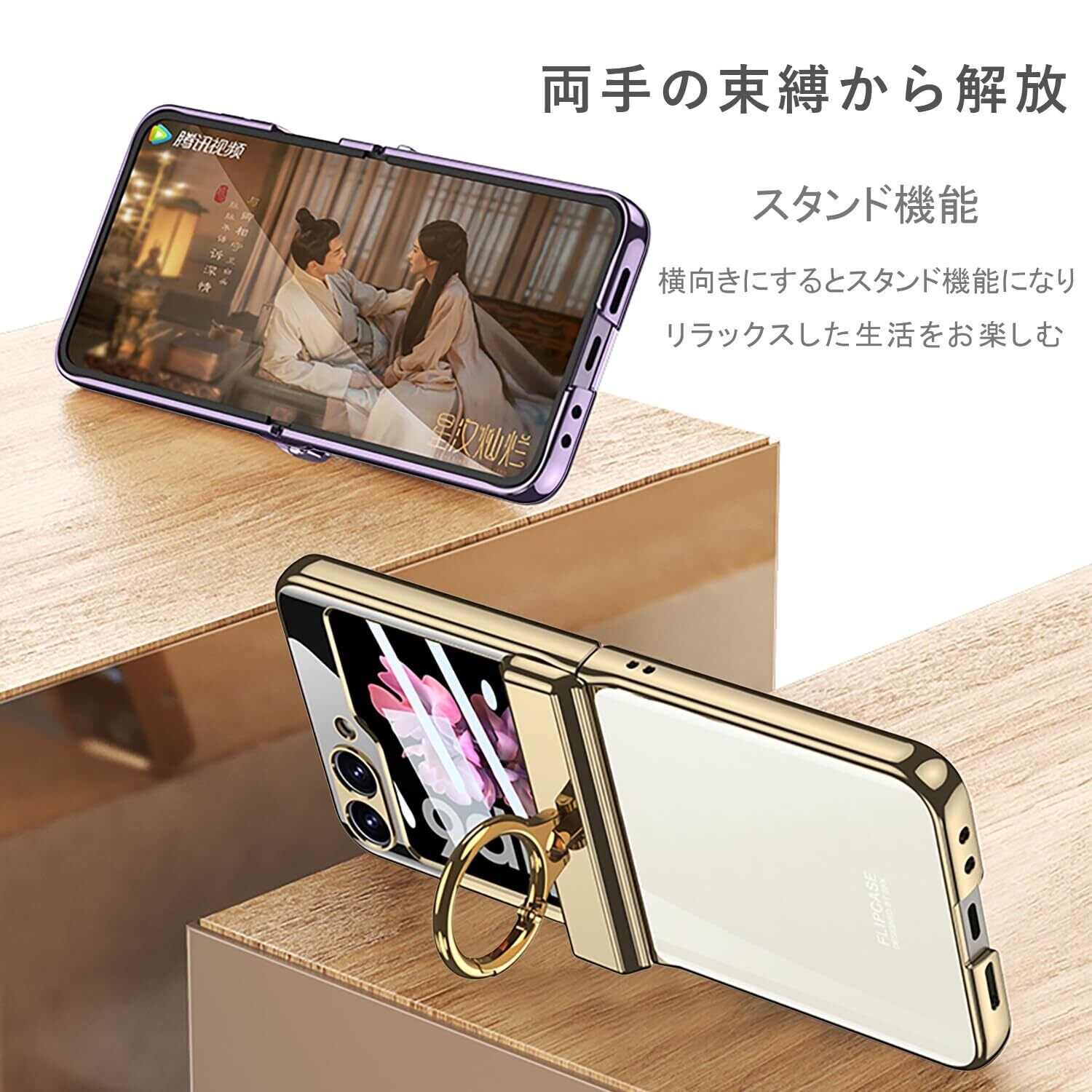 「リング付き・スタンド機能」360°回転できるこのリングは、テーブルに置くだけスタンドに変わり、ちょうど良くスマホをしっかりホールドし、普段は指輪としても活用、不意に落ちる心配もありません。