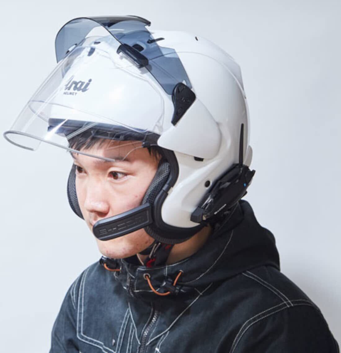 Arai MZ-F/CT-ZやOGK KABUTO EXCEED等のジェットヘルメットでは口元すっきり、走行中もマイク位置がキープできるので安心して会話をお楽しみいただけます。