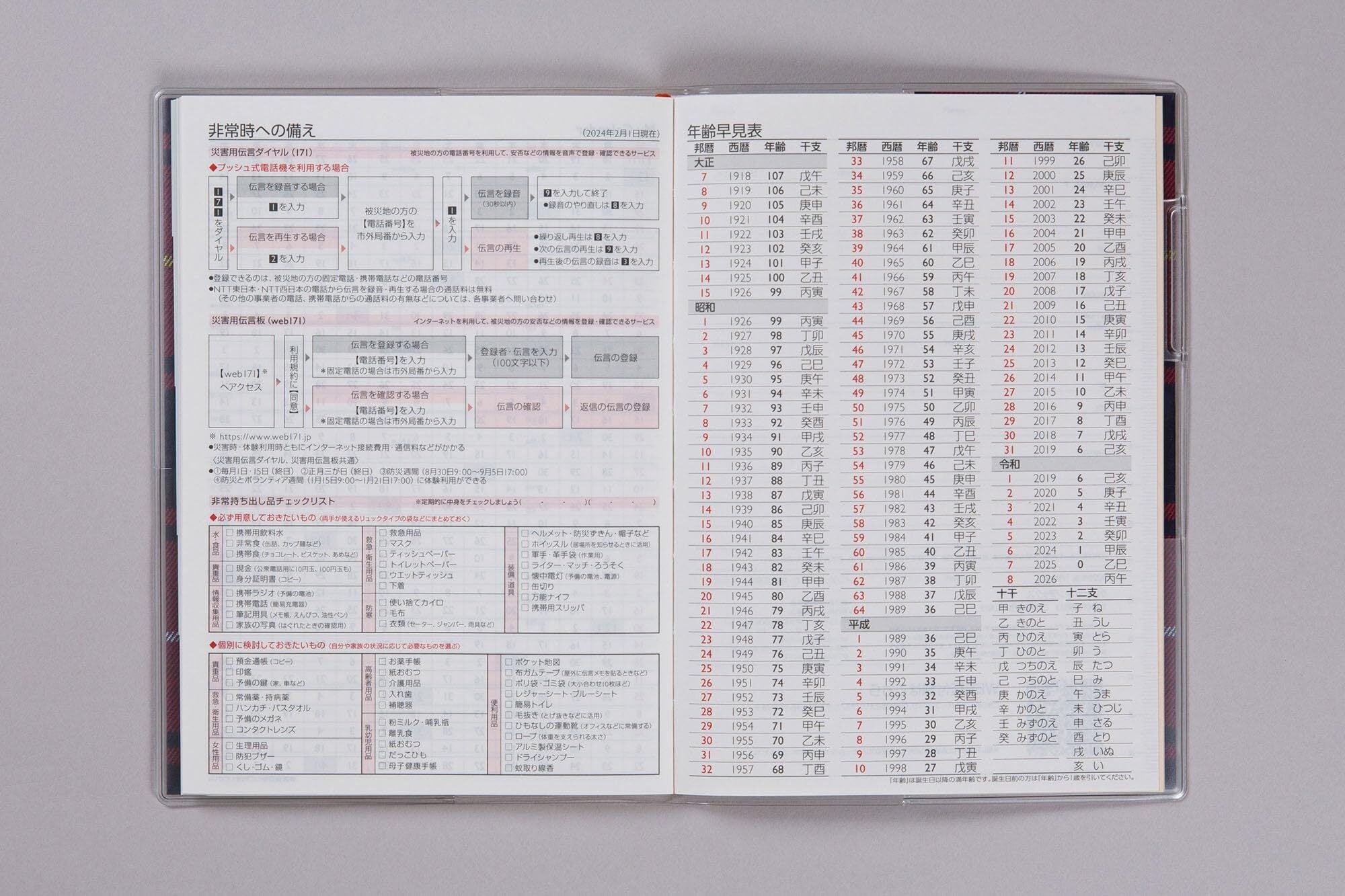 【商品詳細2】表紙タイプ:クリアカバー ●刷色:3色刷 ●ページ数:120頁 ●スペック:ペンホルダー,月別インデックス ●付録:年齢早見表,マイカレンダー,非常時への備え,アドレスメモ,方眼メモ,切り取りメモ ●別冊:なし