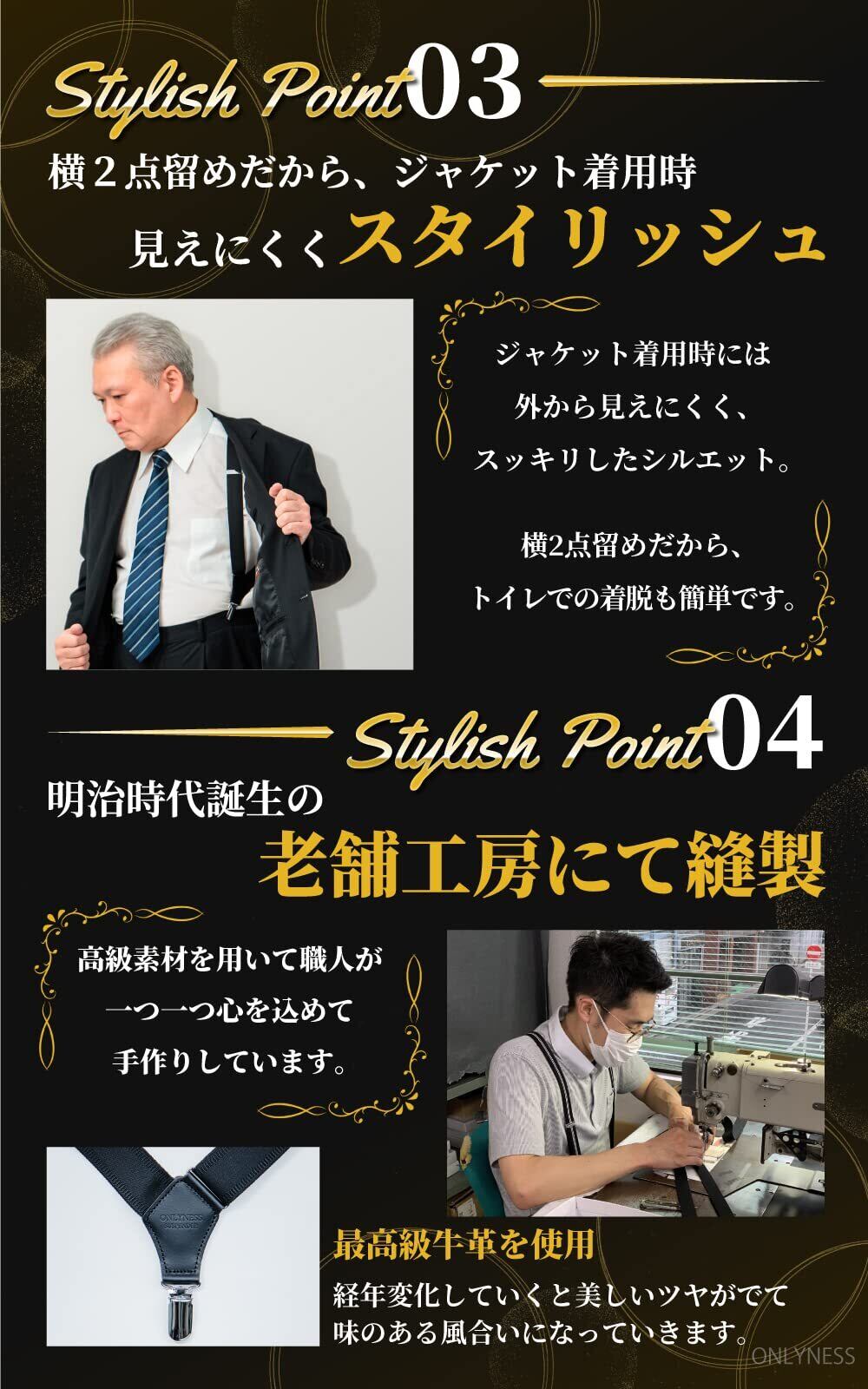 【楽に着脱可能&見えづらさ】 2点留めのホルスター型サスペンダーなので、着脱が簡単でトイレの際でも楽に脱げます。また、サイドに留め具を留めることが出来る為、上着のボタンが開いていてもサスペンダーが見えにくいです。(前面に留め具を付けることで、上着を着てもサスペンダーを見せることもできます。)