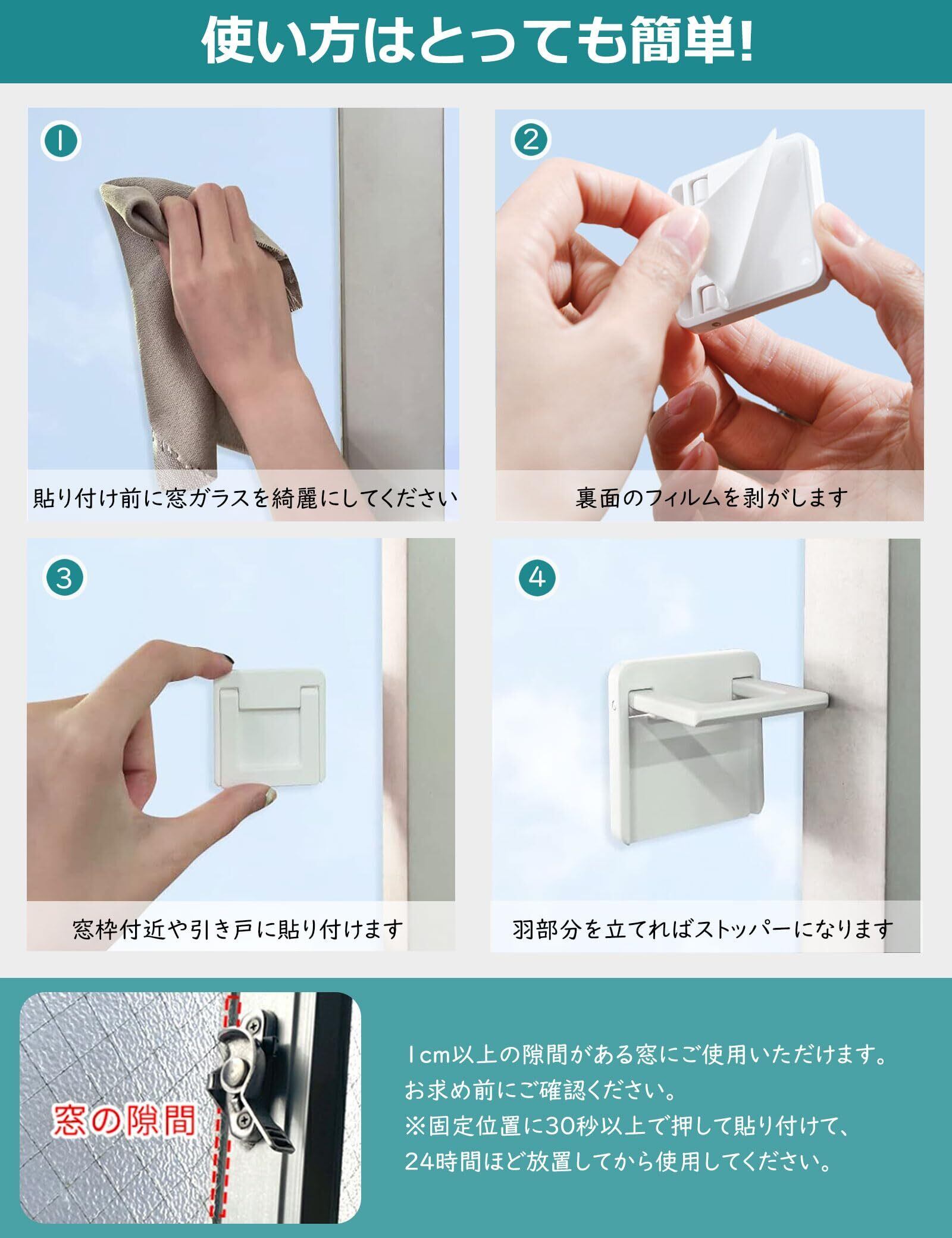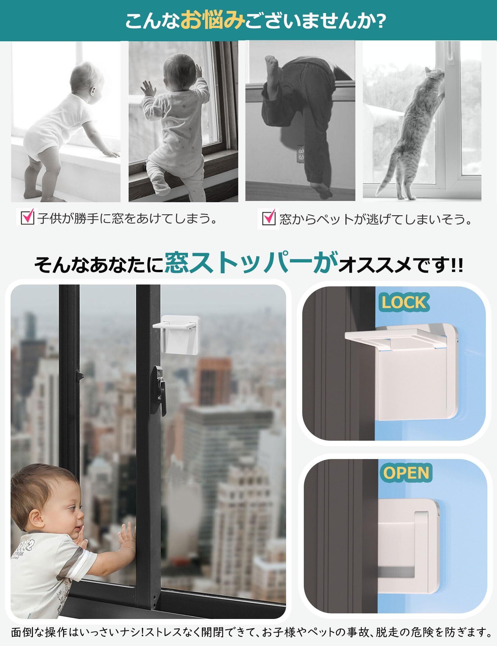 両面テープで貼るだけの簡単安全な窓ストッパーです。お子様やペットのイタズラ、転落防止などの予防にご使用いただけます。