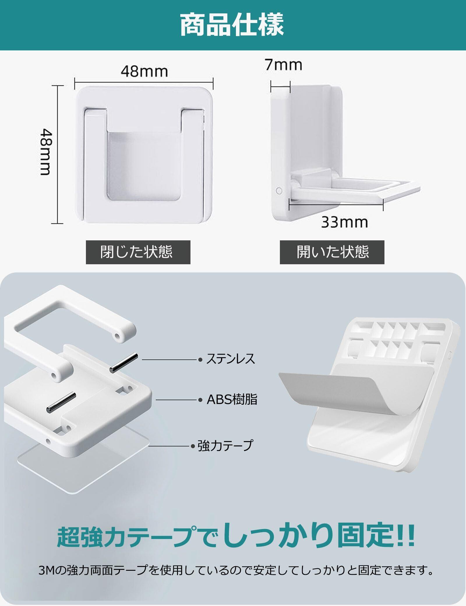 粘着テープで取り付けられるので穴あけや工具不要で簡単に取り付け可能。強い3Mテープを採用し、接着力が強いです。剥がしても家具に跡がつきにくく、キレイに取ることができます。※取り外しの際にはドライヤーで粘着部をよく温めながらお取りください。