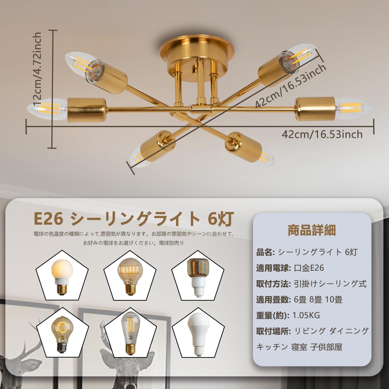 ペンダントライト 6灯 北欧 アンティークレトロ おしゃれ 真鍮色 引掛シーリングライト モダン 天井照明器具 ダイニング 口金E26 リビング 食卓 子供部屋 LED対応 6畳 8畳 工事不要 取付簡単(電球別売り)