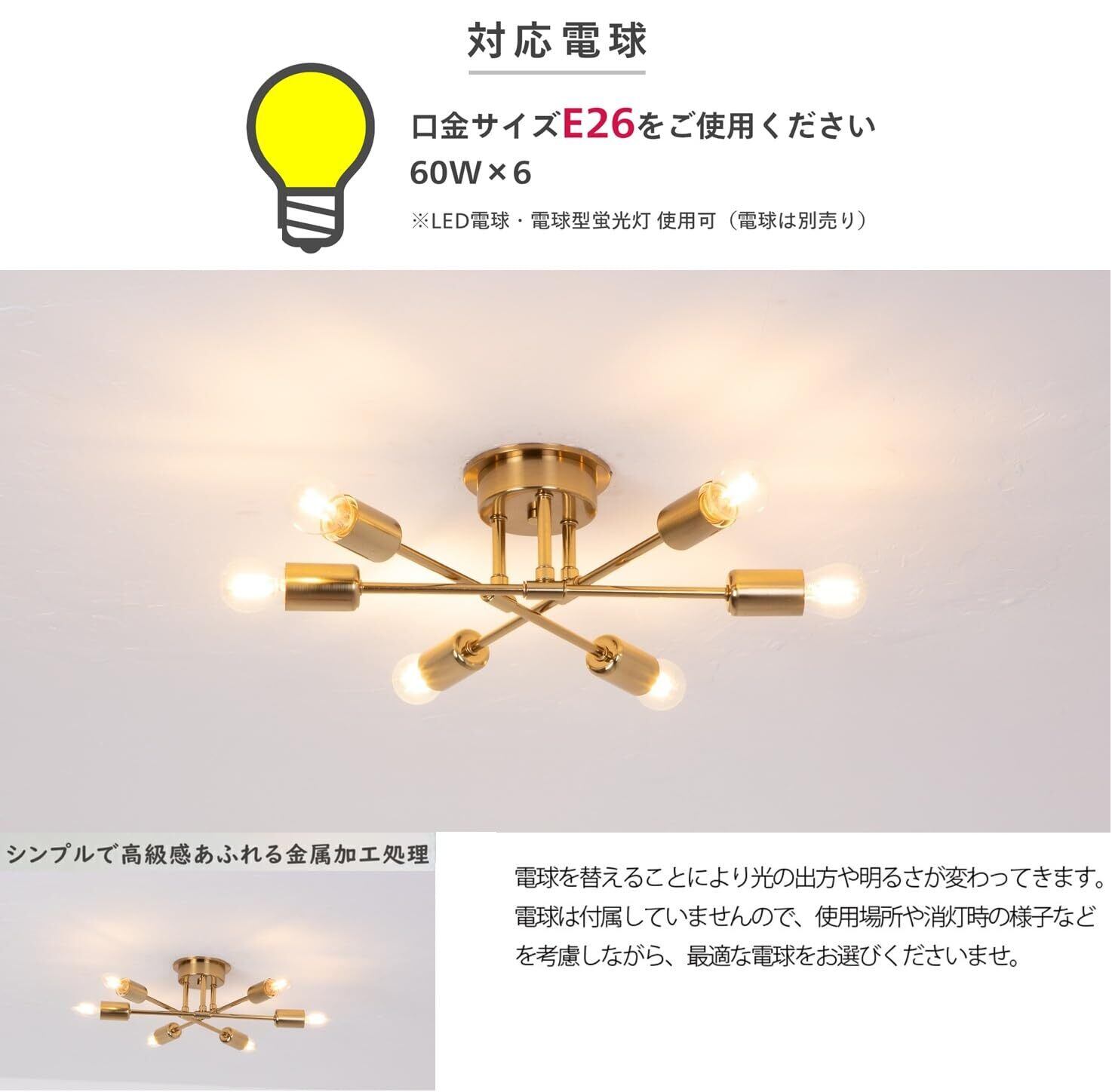 【金属制の本体】ペンダントライト6灯は高品質の金属鉄で作られたレトロなシーリングライト。サイズ:約42×42×12cm「定格電圧」85-250V「重量」約1.2kg。消費電力:MAX.100W 電球対応:E26(電球は付属しません)日本説明書付き ※追加:電球が付きません。予めご了承してください。