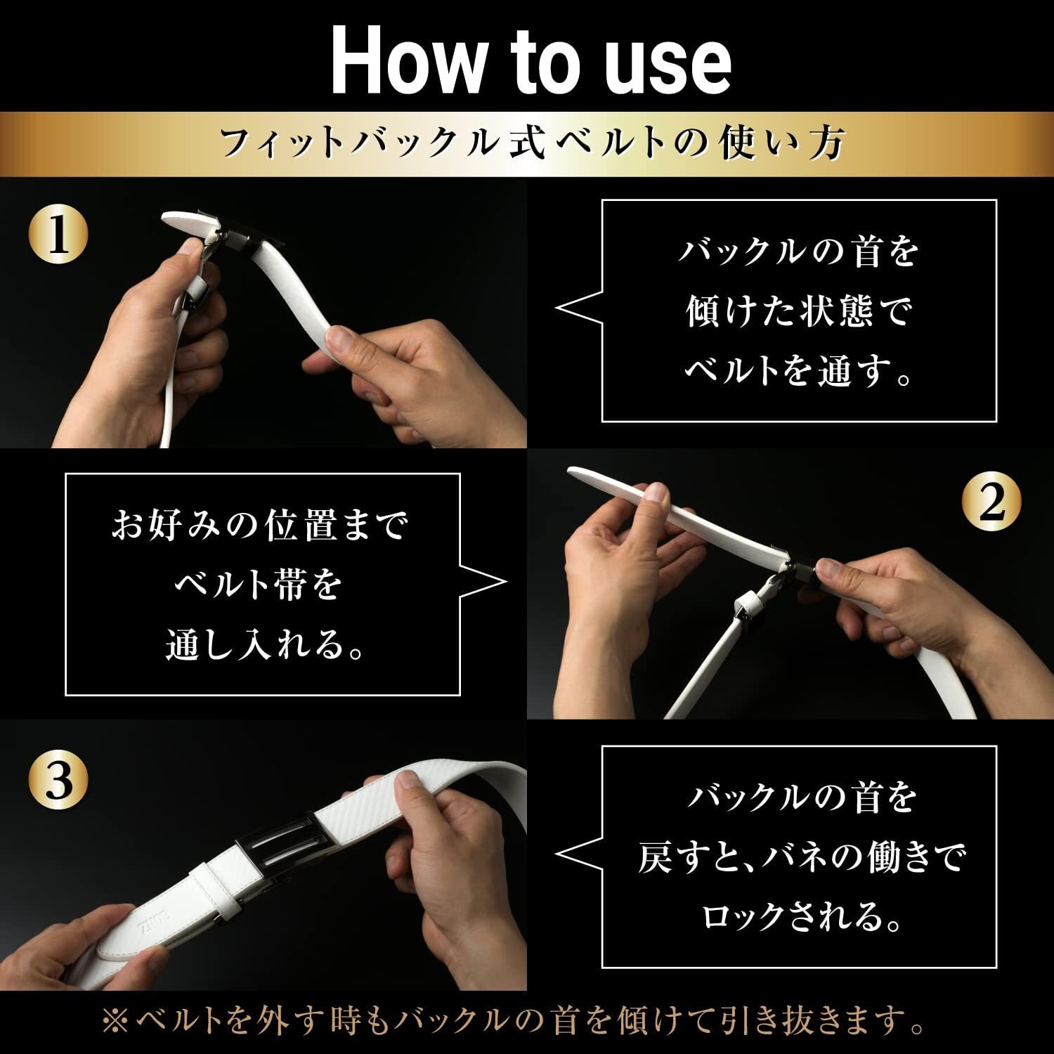 【無段階調節可能!フィットバックル式ベルト】ベルト穴がなく、ウエストにしっかりフィットするよう微調節ができるメンズベルト。便利なオートロック式で、食後などベルトを緩めたい場合にもちょうどいい所で調節が可能です。また、穴がないため帯が劣化しにくいのもポイント。帯は耐久性に優れた人工皮革を採用しています。開封当初は帯は硬いですがすぐになじみます。ウェストサイズに合わせて帯をカットしてください。着脱はバックルを斜めに傾けると簡単です。