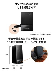 低音の量感を、手軽に調整可能:BASS調整ボリュームノブをスピーカー前⾯に搭載。聴きたいコンテンツにあわせて、低⾳の量感を調整できます。例えば、動画や⾳楽などを迫⼒ある⾳で楽しみたい時や、深夜帯に使⽤する際に低⾳を絞って周囲に配慮するなど、状況に応じた使い分けが可能です。