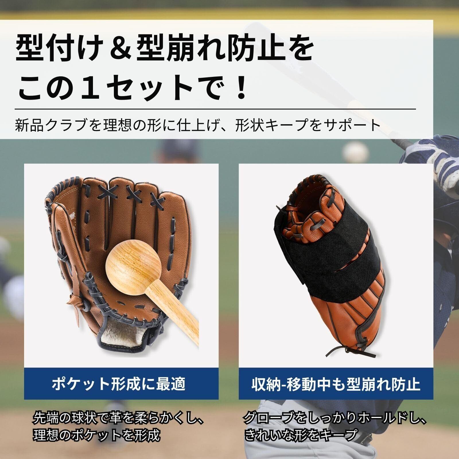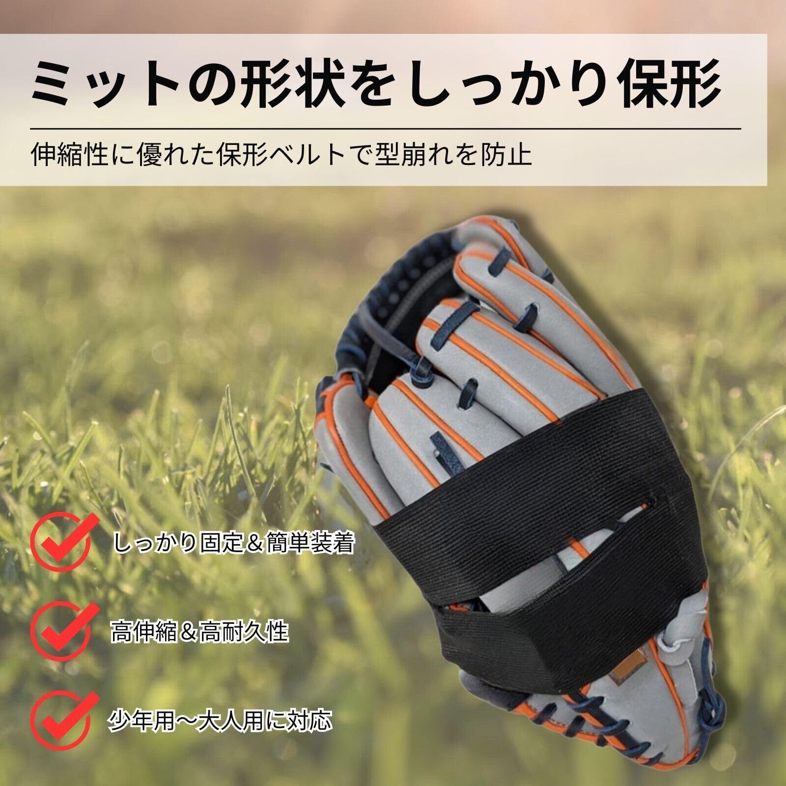 【保形ベルトで型崩れを防止】 仕上げたグローブの形を保つために、保形ベルトでしっかりホールド。ポケット部分や全体をしっかり固定することで、収納時や移動中も型崩れを防ぎます。伸縮性に優れた素材とマジックテープ仕様で使いやすく、大人用から子供用まで幅広く対応。日常的なグローブのケアに役立ちます。