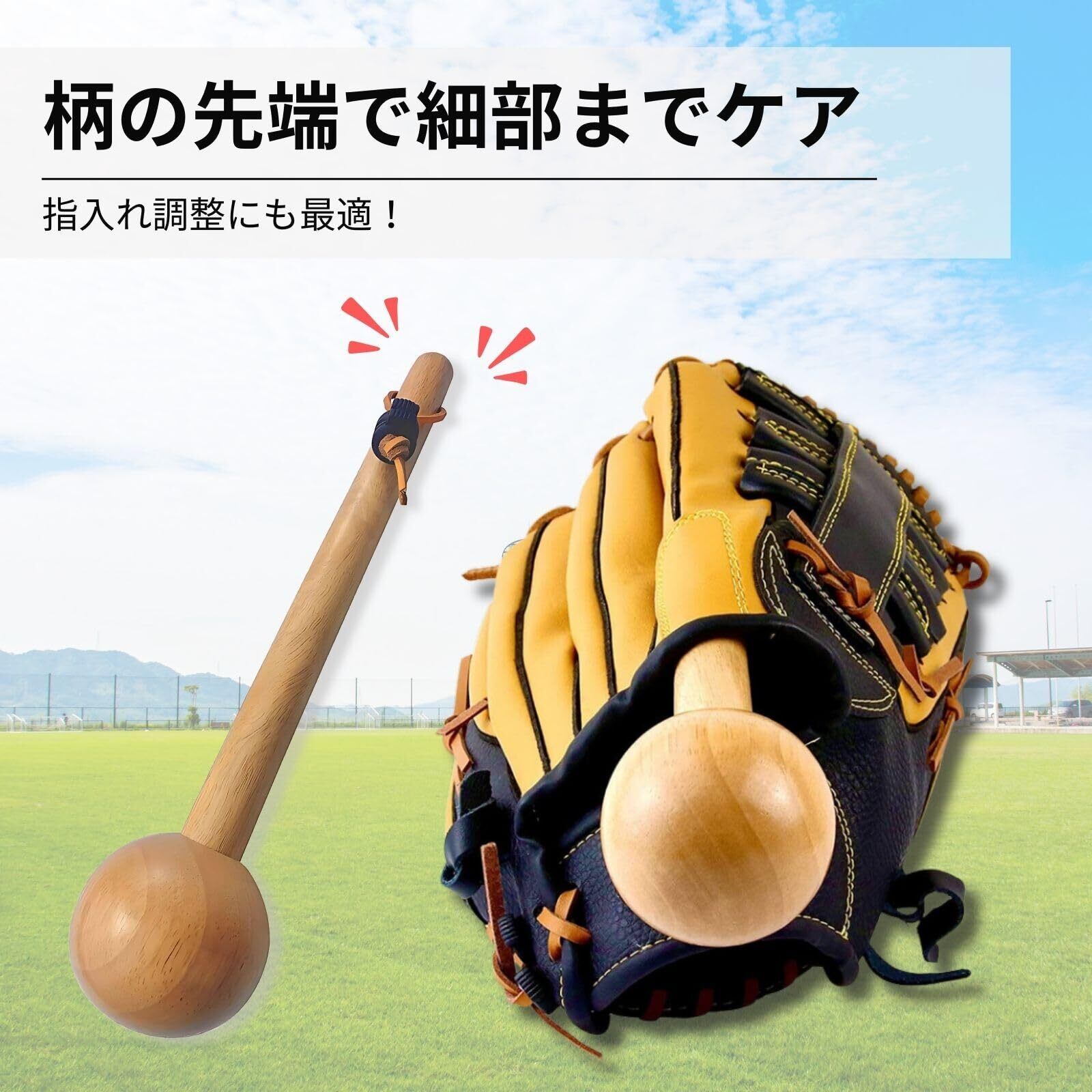 【グラブハンマーでポケットをしっかり形成】 ハンマーの先端はボール状に設計されており、ポケット部分を効率よく成形できます。革の硬さを和らげ、キャッチ時にボールが収まりやすい理想的なポケットに仕上げられます。柄の部分は指の通りやウェブ周辺の調整に便利で、細部までこだわった型付けが可能です。
