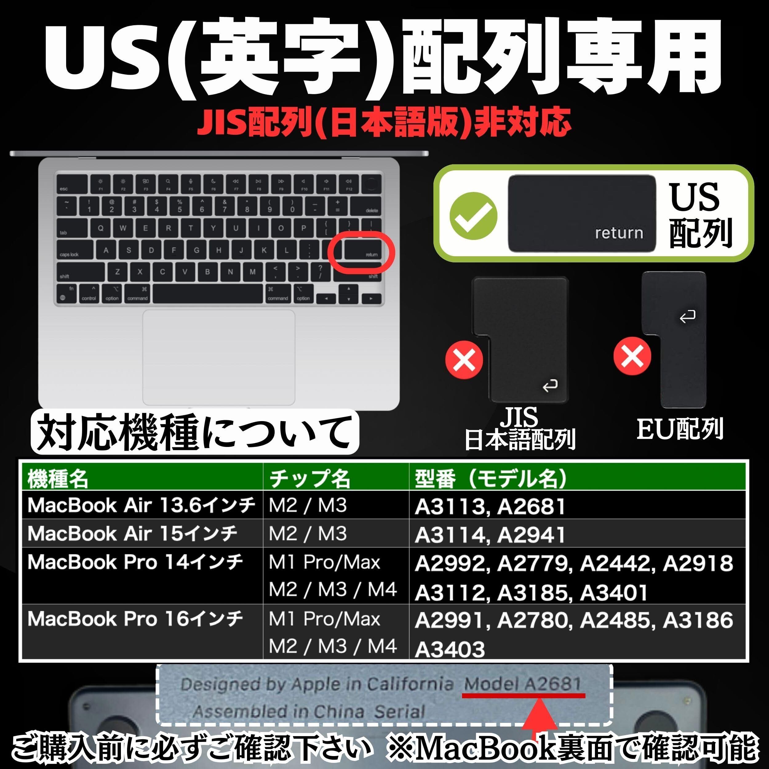 【対応モデル多数】MacBook Air 13.6 / 15インチ、Pro 14 / 16インチ(JIS配列)に対応。A3113 / A3114 / A2991 / A2992 / A2779 / A2780 / A2442 / A2485 / A2941 / A2681 / A2918 / A3112 / A3185 / A3186 / A3401 / A3403 など、最新のM1〜M4チップ搭載(Appleシリコン)MacBook Air / Proに幅広く対応。お使いのモデルにぴったり合うカバーを選べます。、US配列のキーボードレイアウトを完璧にカバーします。