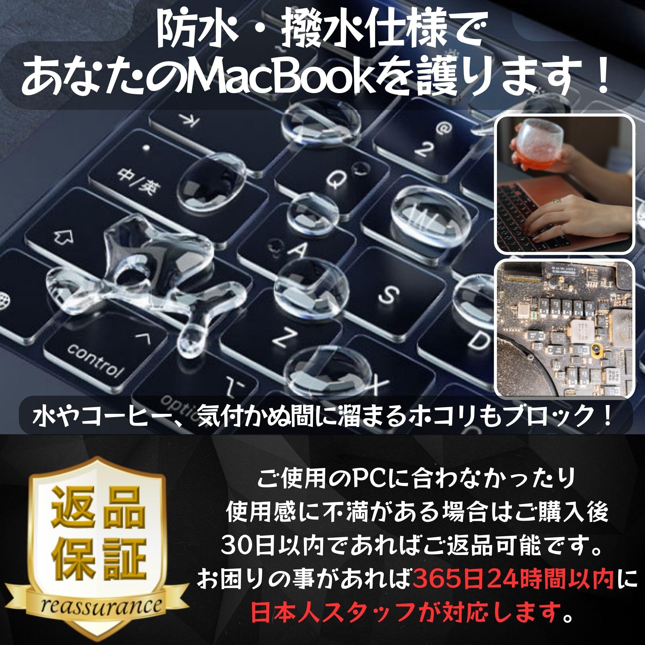 【透明性と保護】透明度が高く、キーボードのバックライトが美しく透過します。キーボードの見た目を損なわず、同時に液体や食べ物のこぼれからも保護します。日常の使用において、Macbookを安心して使い続けることができます。