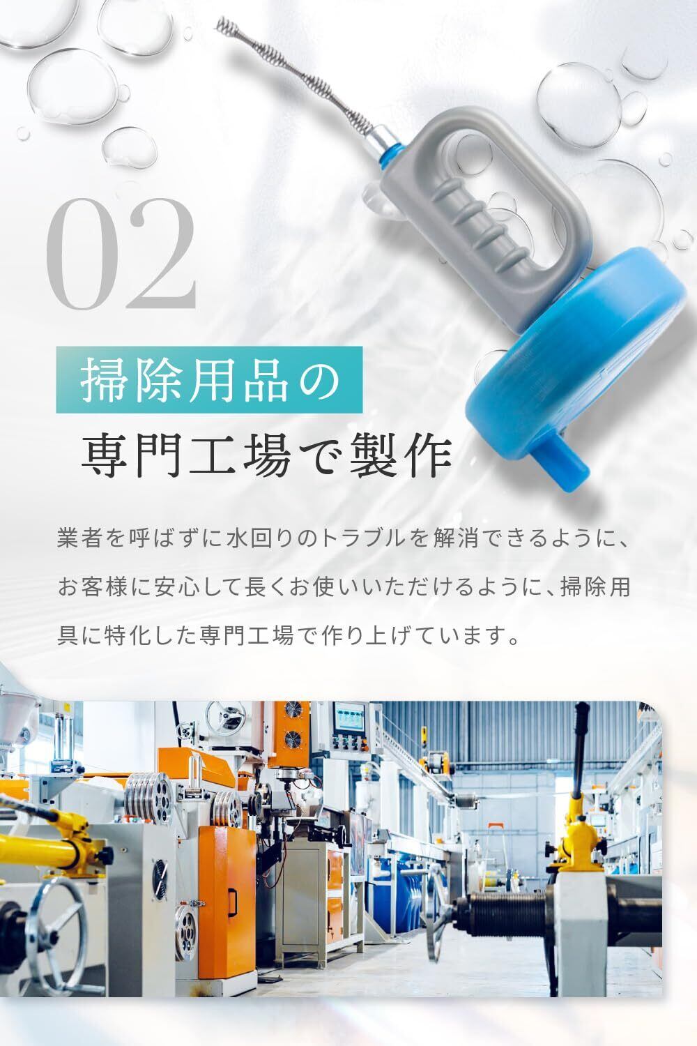 【様々なシーンでご使用可能】台所、洗面台、お風呂、P字、S字パイプ等、様々なところでお使い頂けます。業務用清掃ブラシとしても大活躍。*2cm以下の穴、格子形状の排水口、トラップ付きパイプにはご使用頂けません。P字、S字の場合でもつまりの状態や配管の太さなどによってはご使用できない場合があります。キッチンや排水パイプの形状によっては通らないものがあります。あらかじめ、排水パイプ にワイヤーが通るか、管理会社等にご自宅の構造をご確認ください。