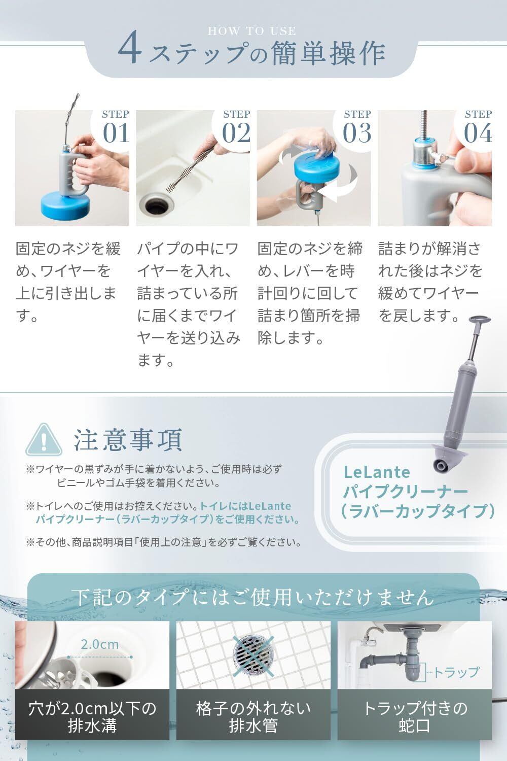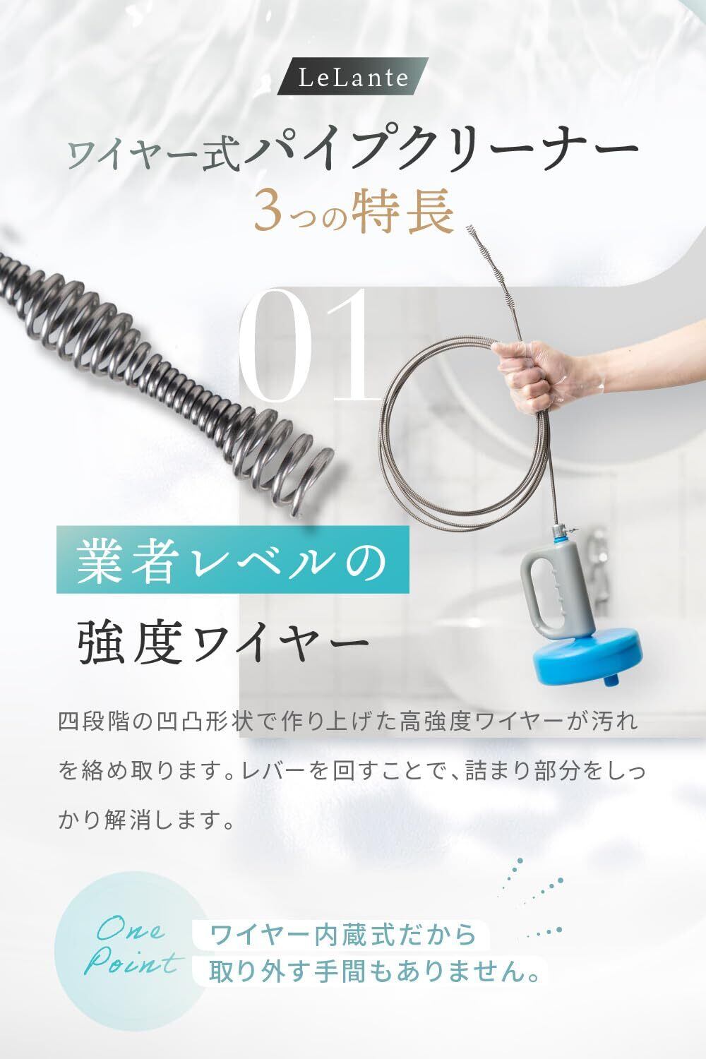 【選ばれる理由】LeLante パイプクリーナー がついに正式販売開始。液体タイプやラバーカップで解消できない詰まりも、ワイヤー で取り除くことが出来ます。本商品はワイヤーをドリルのようにで回転させ、つまりに物理的に干渉し、解消することを目的とした商品です。 状況によっては解消できない場合がありますことをご理解の上、ご使用ください。