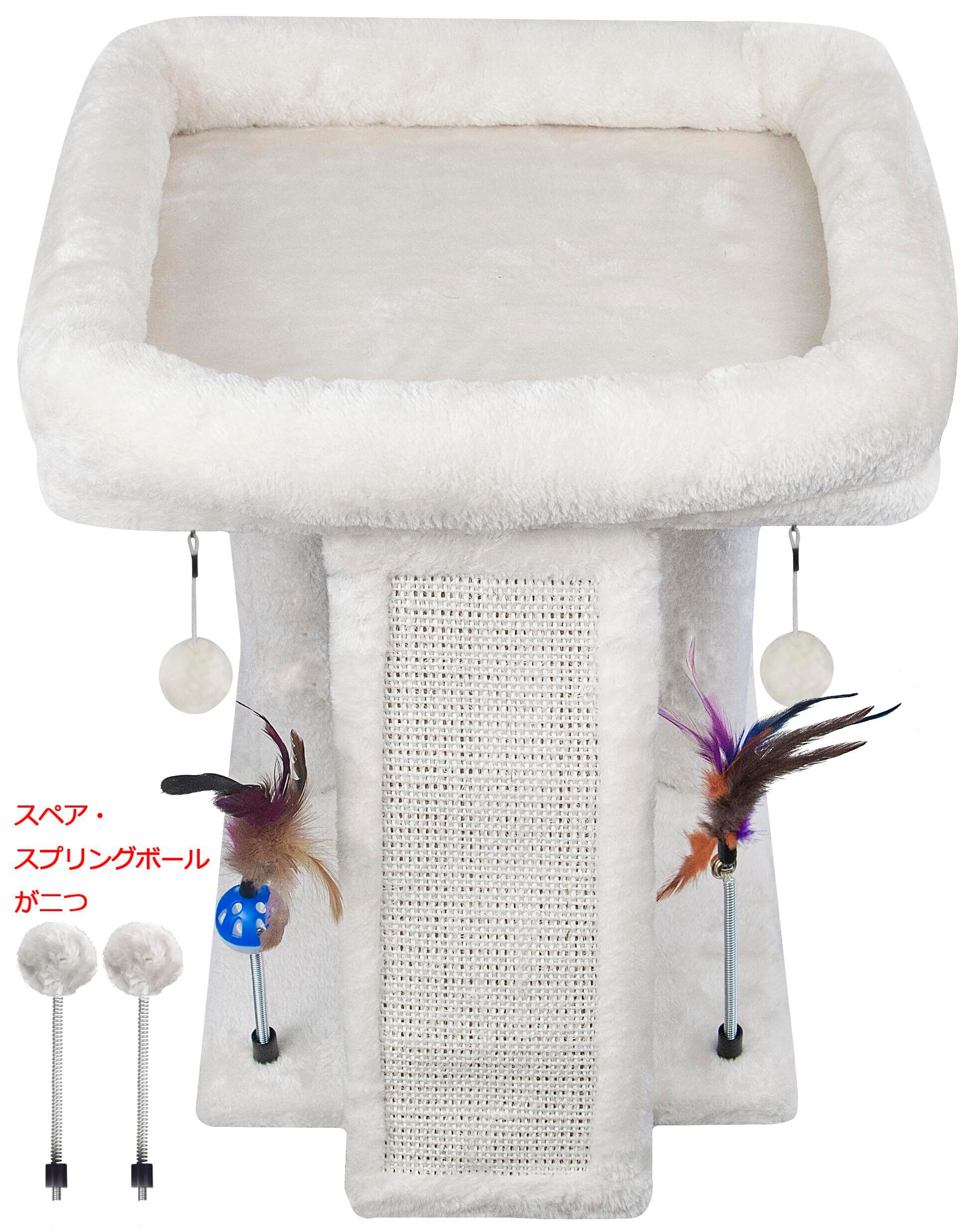 コンパクトのキャットタワーですが、爪とぎ板、猫パンチ用の吊り下げとスプリングボール、くつろげる高台、快適に過ごせるポイントが満載!