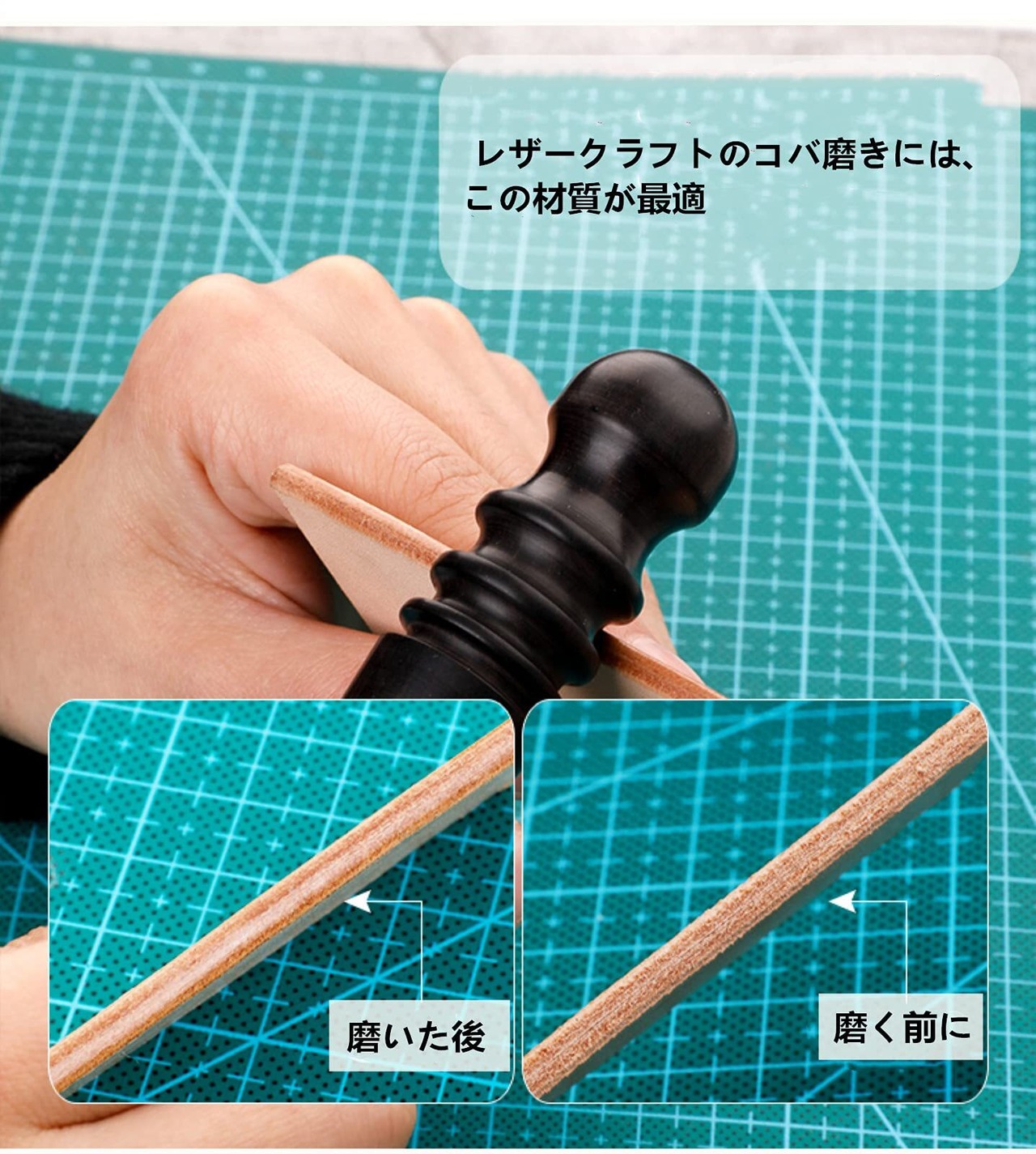 「この『コバ磨き 黒檀製』を使って、あなたのレザークラフト作品を一層美しく仕上げましょう!初心者でも簡単に扱えるこの工具が、あなたのクリエイティブな活動をより豊かにすることでしょう!」