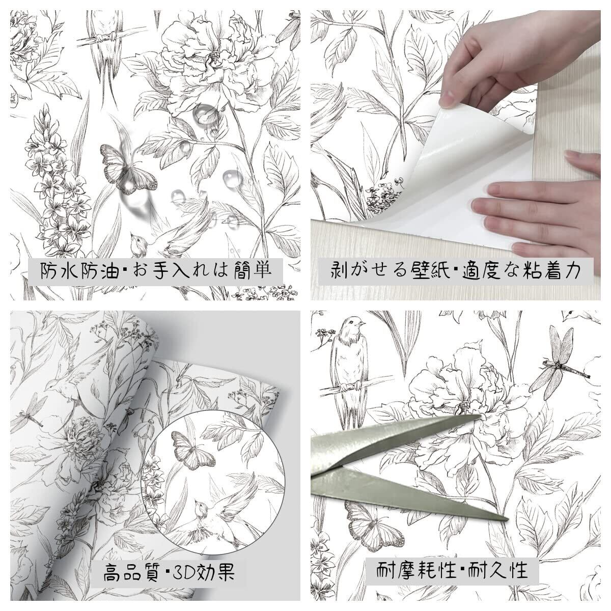 ● 特徴:剥がせる壁紙、花鳥柄デザイン、防水加工、厚手PVC素材、DIYに最適