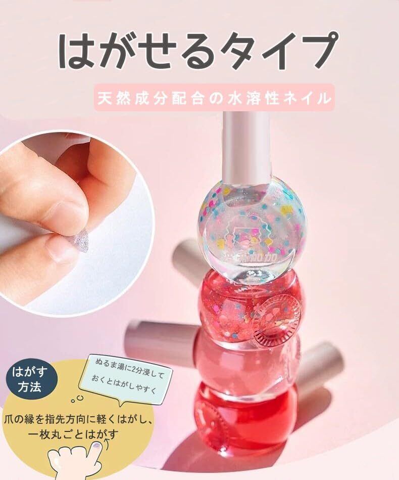 【水溶性ネイル】天然成分配合の優しい水溶性ネイルです。 爪が薄いお子さまはもちろん、爪をいたわるママにもぴったり。 すぐに落とせるから、休日の親子の楽しみに。水溶性のネイルですので、内容物が分離沈殿していることがあります。 製品に問題はございませんので、よく振ってからお使いください。