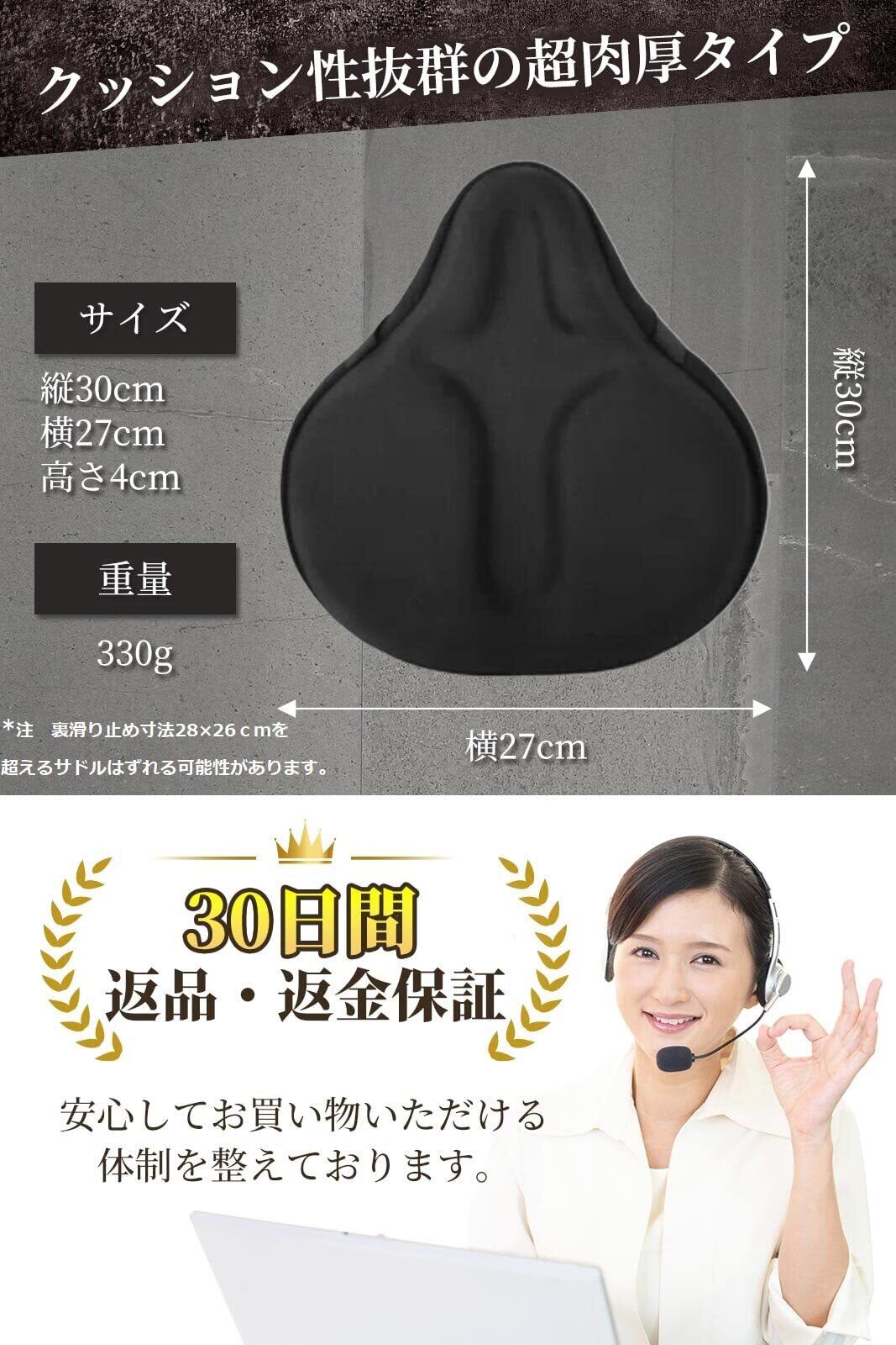 【■超肉厚!ジェルパッド×高密度ウレタンスポンジのW効果】厚さ10mmのシリコンジェルパッドと、厚さ20mmの高密度ウレタンスポンジを重ね合わせた超肉厚タイプ。抜群のクッション性と強い復元力。充分な厚みで衝撃をしっかり吸収し、お尻にかかる負担を軽減します。 【■サドルが生き返る】硬い・乗り心地が悪い・劣化してしまったサドル。新しく交換できない場合でも、本カバーをかぶせれば再利用可能です。サドルにカバーをかぶせ、ひもを結ぶだけ。簡単に装着、しっかり固定でき、すぐに快適なサドルが完成。ふかふかのサドルに気持ちよくお座りいただけます。 【■いろんなタイプの自転車やバイクに】エアロバイク・ママチャリ・クロスバイク・アシスト自転車などにぴったり。トレーニング・お子さまの送迎・お買い物・お出かけ・通勤・通学等で、日常的に自転車に乗る方におすすめです。超肉厚クッションが衝撃を吸収し、お尻の痛みを気にせず安全に乗ることができます。※横幅の狭いスポーツタイプのサドルにはご使用頂けません。 【■安全面と使いやすさ】カバーの装着力を高める滑り止め加工や、蒸れ・熱・匂いを上手に逃がす座面形状の特殊加工など、使いやすい工夫が随所に。細かい配慮がなされているので、いつも快適にご使用いただけます。