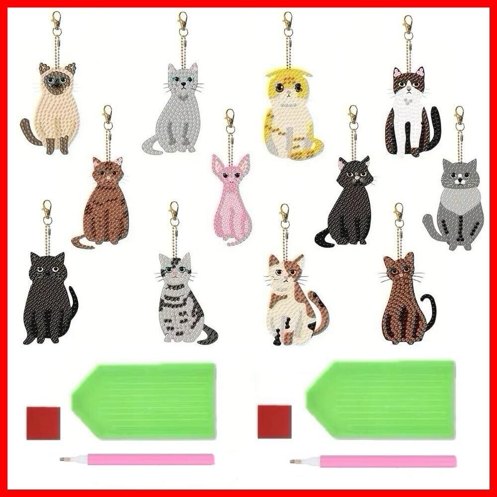LIXTONE ダイヤモンドアート キーホルダー 手作りキット 女の子 アクセサリー ペンダント (猫12個(ペン・トレー2セット、チャック袋入))