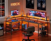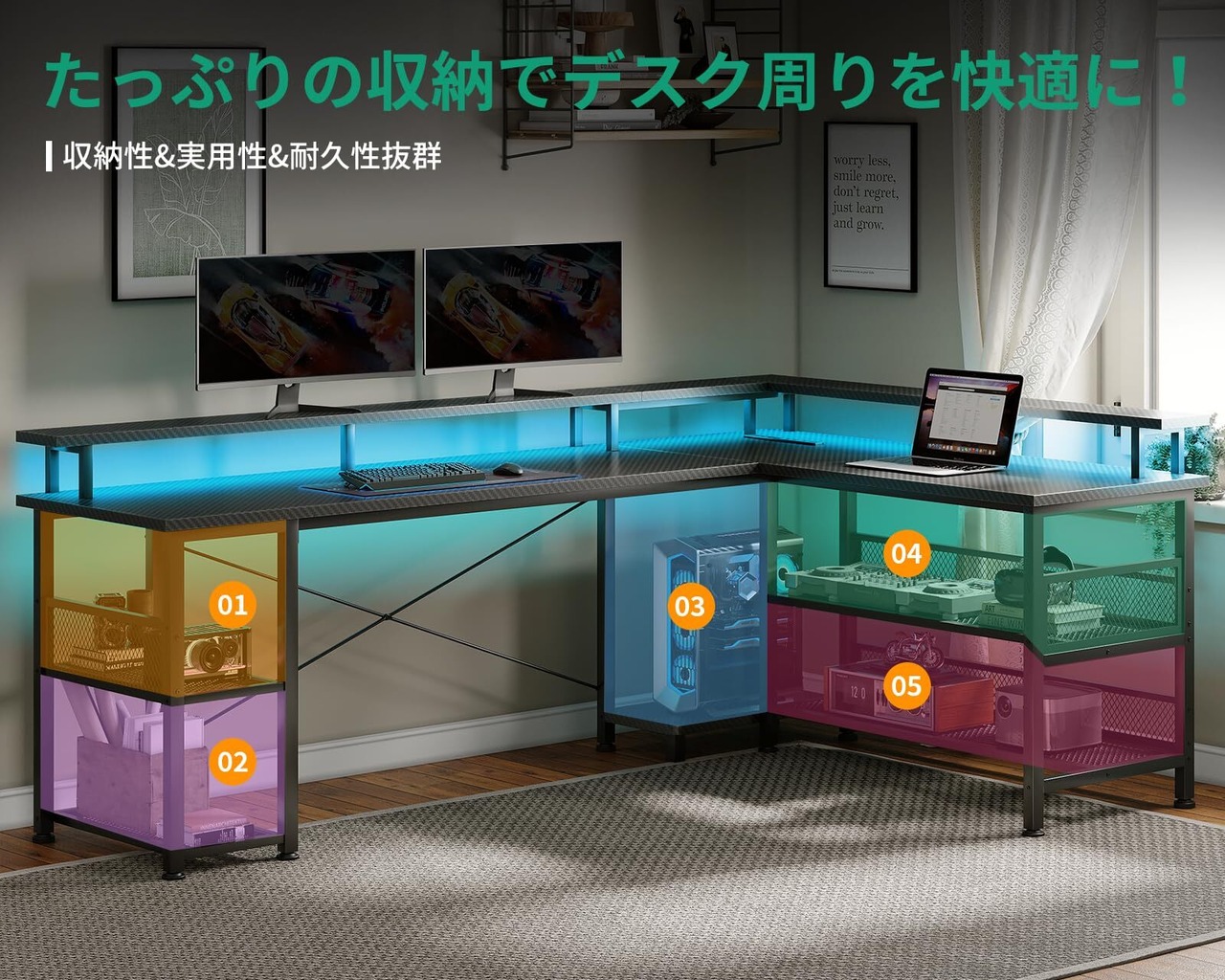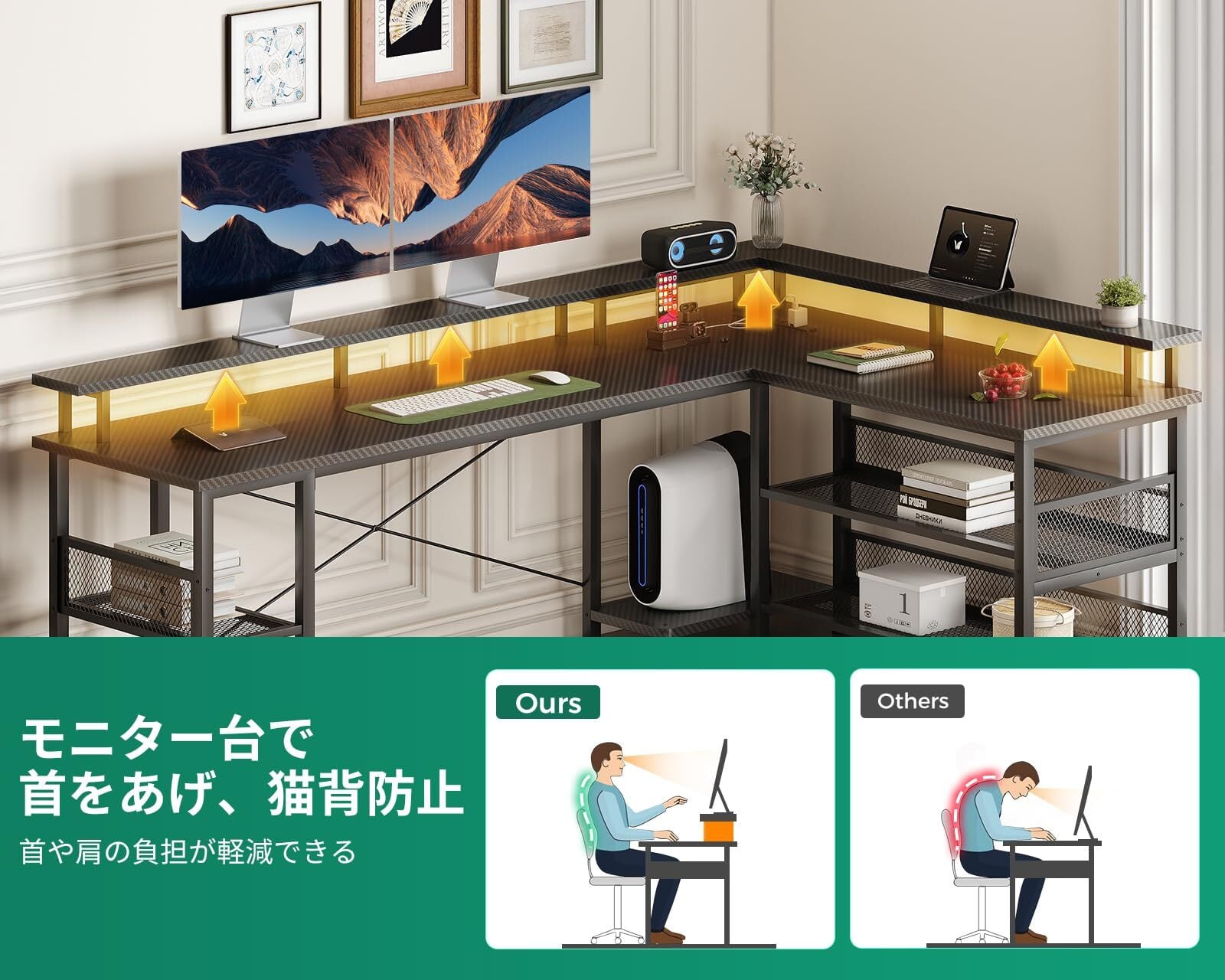 【LEDライトでスタイリッシュに!】 : デスクの一部にはLEDライトが組み込まれており、かっこよさと実用性を兼ね備えています。夜間の作業やゲームプレイも明るく照らし、視認性が向上します。作業の効率を高めるだけでなく、デザイン性も高い一品です。