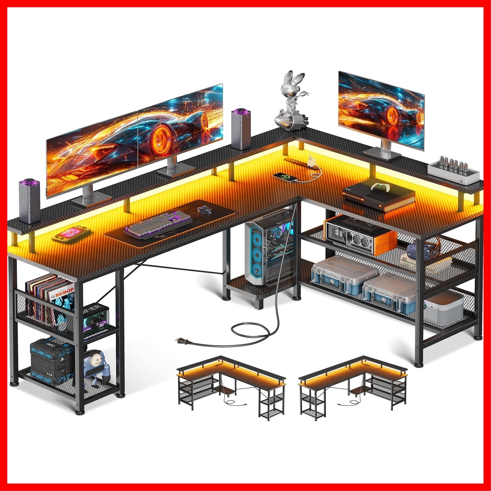 【コンセント付きデスク・ゲームと仕事両立】パソコンデスクとしてはもちろん、ゲーミングデスクとしても使用できるおしゃれなL字デスク。机には、2つのACコンセントとUSB ポート付きで、パソコンやスマホなどの充電ができて超便利です。また、ラックは間取りや利き手に合わせて左右付け替え可能。