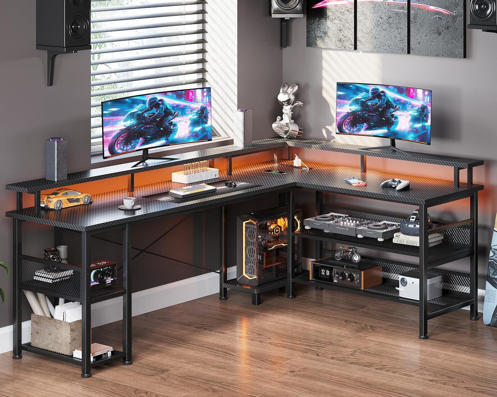 AODK ゲーミングデスク パソコンデスク コンセント l字デスク 机 pcデスク LEDライト 勉強机 棚付き オフィスデスク 幅168 ワークデスク 桌子 在宅勤務 事務机 組立簡単 カーボンブラック