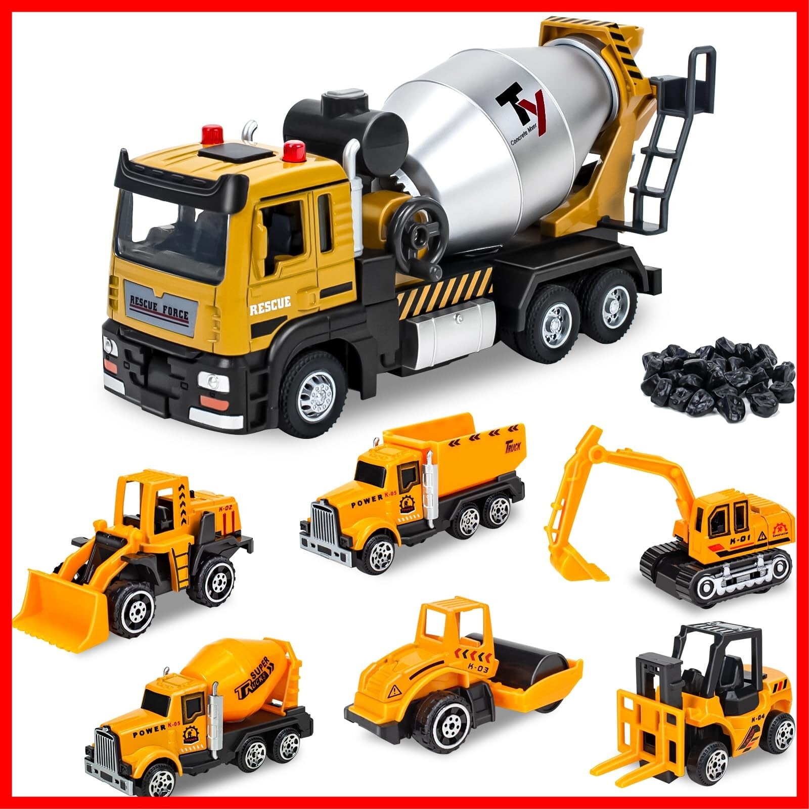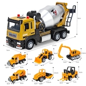 7点セットの建設車両: ランダム包装には、ショベルカー*1、ブルドーザー*1、ローラー*1、ダンプ*1、フォークリフト*1、ミキサー車*2が含まれている。小さなオブジェクトとおもちゃの割合は1:64で、大きなミキサー車の割合は:1:32で、ミキサーが付加されているので、建設現場をリアルに再現することができます。