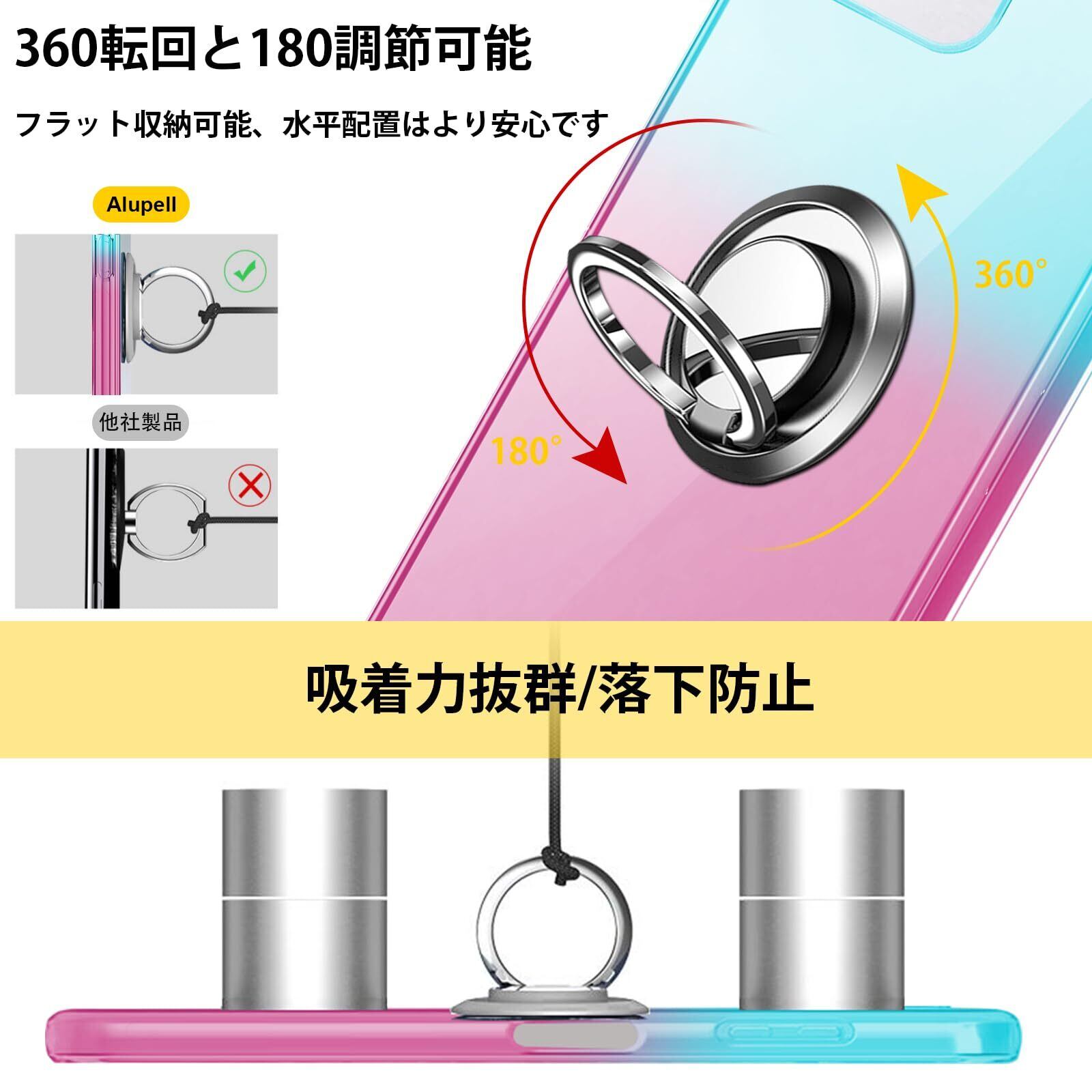 【360°回転】ブラケットは360°回転できます、垂直画面で小説を読むことができます、または、画面全体でビデオを見る。一指着る式で、指がリングに通り抜け、片手で携帯を操作でき、落下防止します。