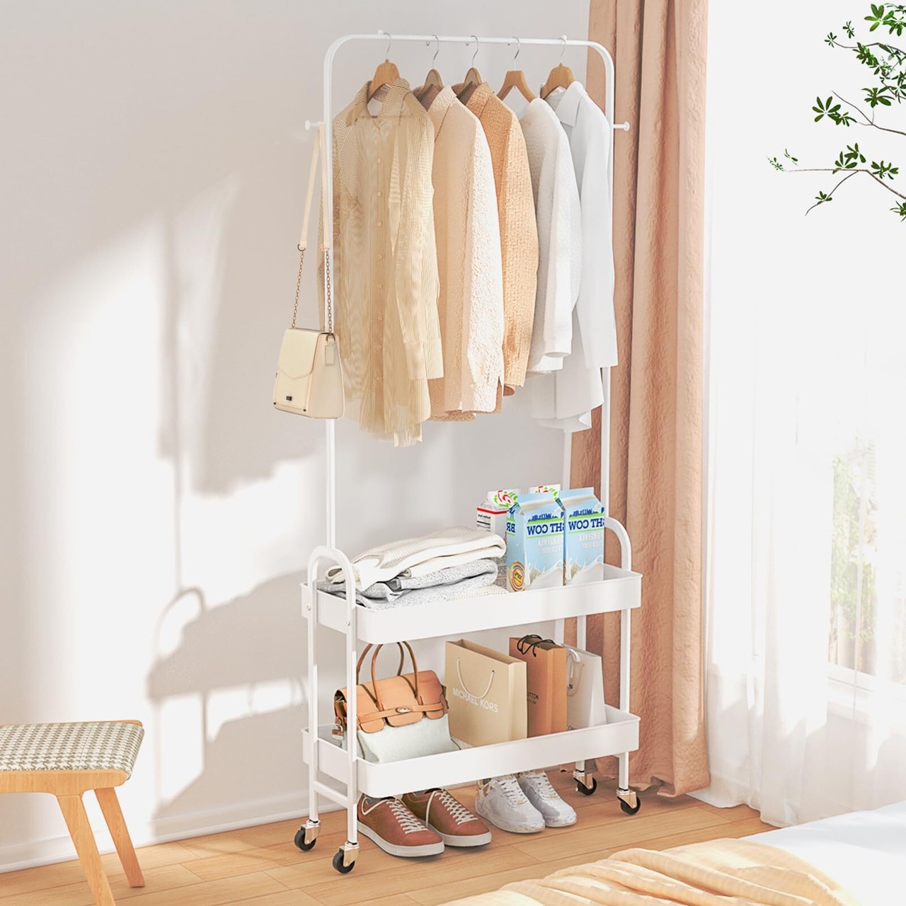 WISH SUN ハンガーラック キャスター付き トローリーハンガー ワゴン 服 パイプハンガー 洋服ラック スチール 衣装ラック 2段カゴ 多機能 おしゃれ スリム 組立簡単 頑丈 大容量 メッシュ棚 幅66cm×奥行30cm×高さ160cm | hananoki
