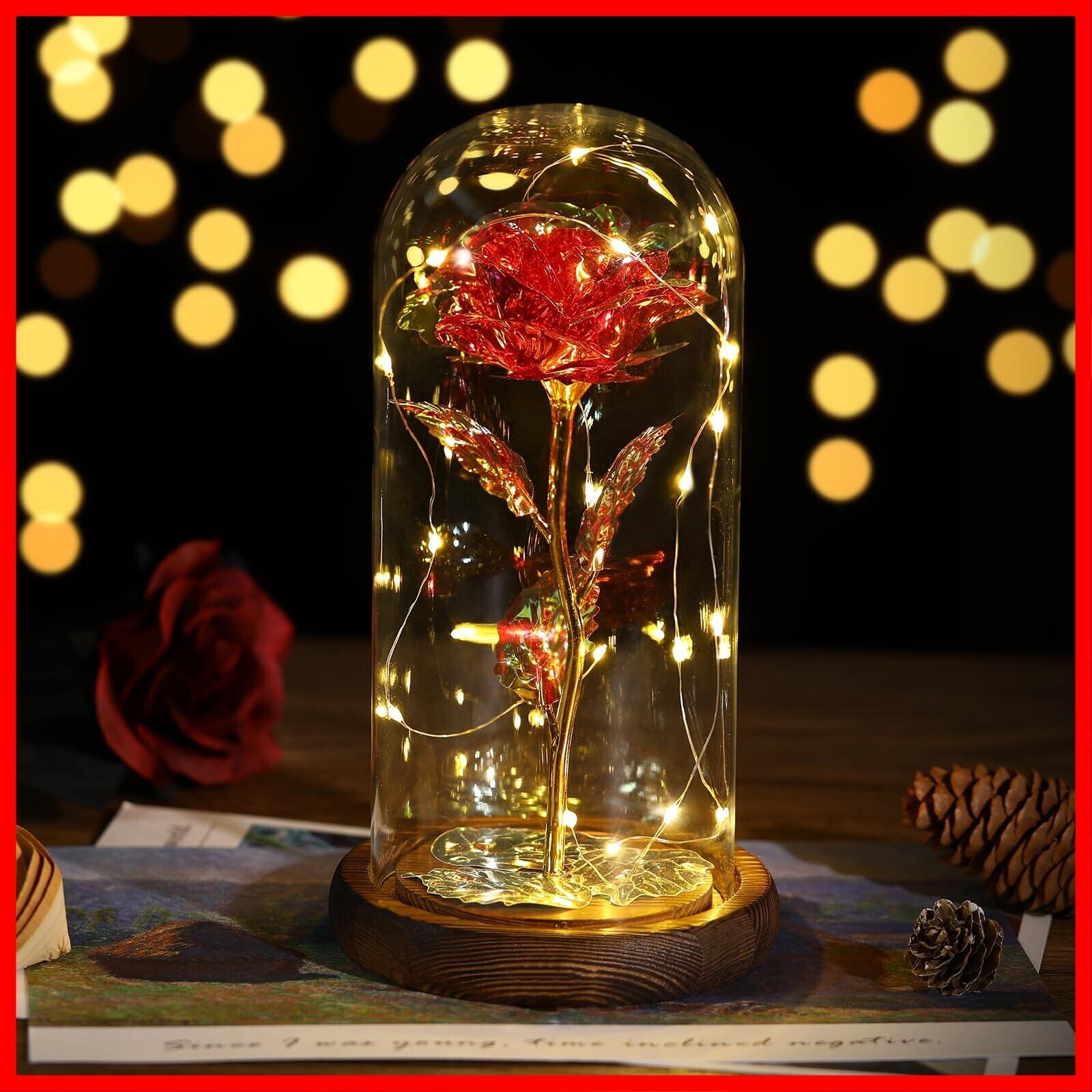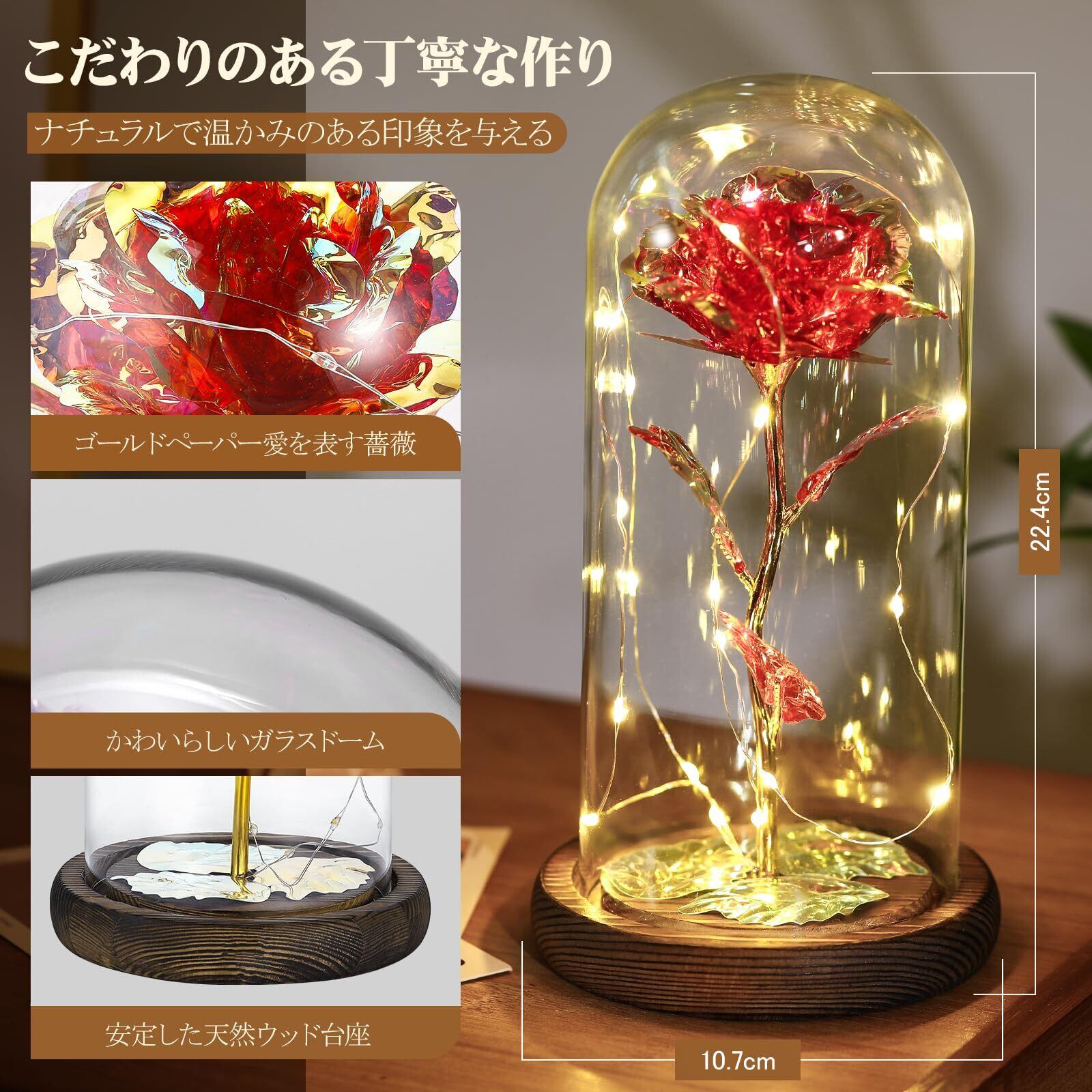 Lewondr バラ 造花 ガラスドーム 枯れない花 メッキローズ バレンタイン飾り 長持ち LEDライト付き 部屋飾り インテリア 引越しバラ/母の日/記念日/誕生日/入学/卒業/お祝い/お見舞い/お礼/彼女 クリスマス 飾り クリスマスライト ボックス付き 紅1輪