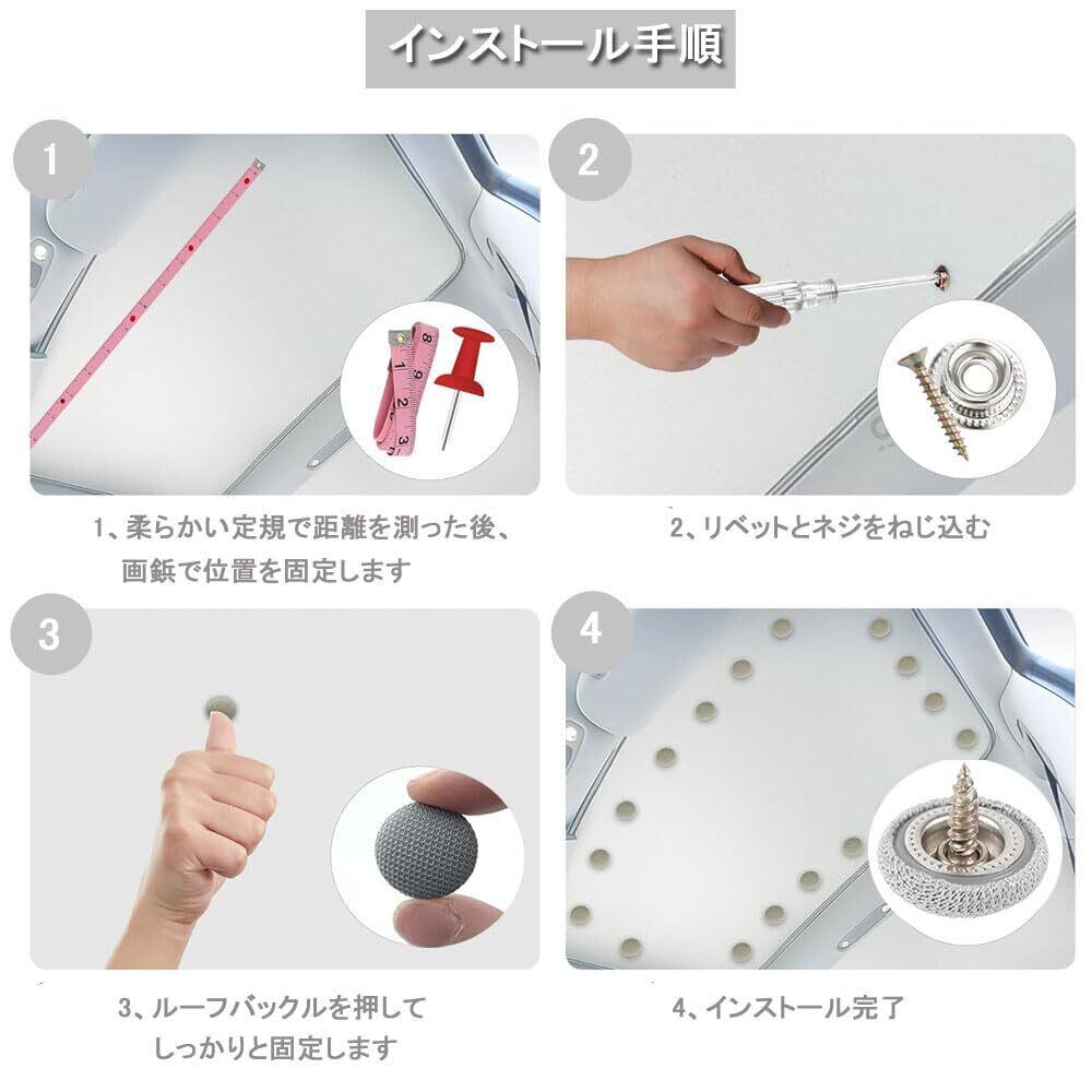 【簡単取り付け】巻き尺を使用して距離を測定し、垂下したルーフを位置決めし、画鋲で位置決めした後、ベースをネジで固定し、ネットアイボタンをカバーする。他のツールは必要ありません。設置距離は12 ~ 15 cmが推奨されています。