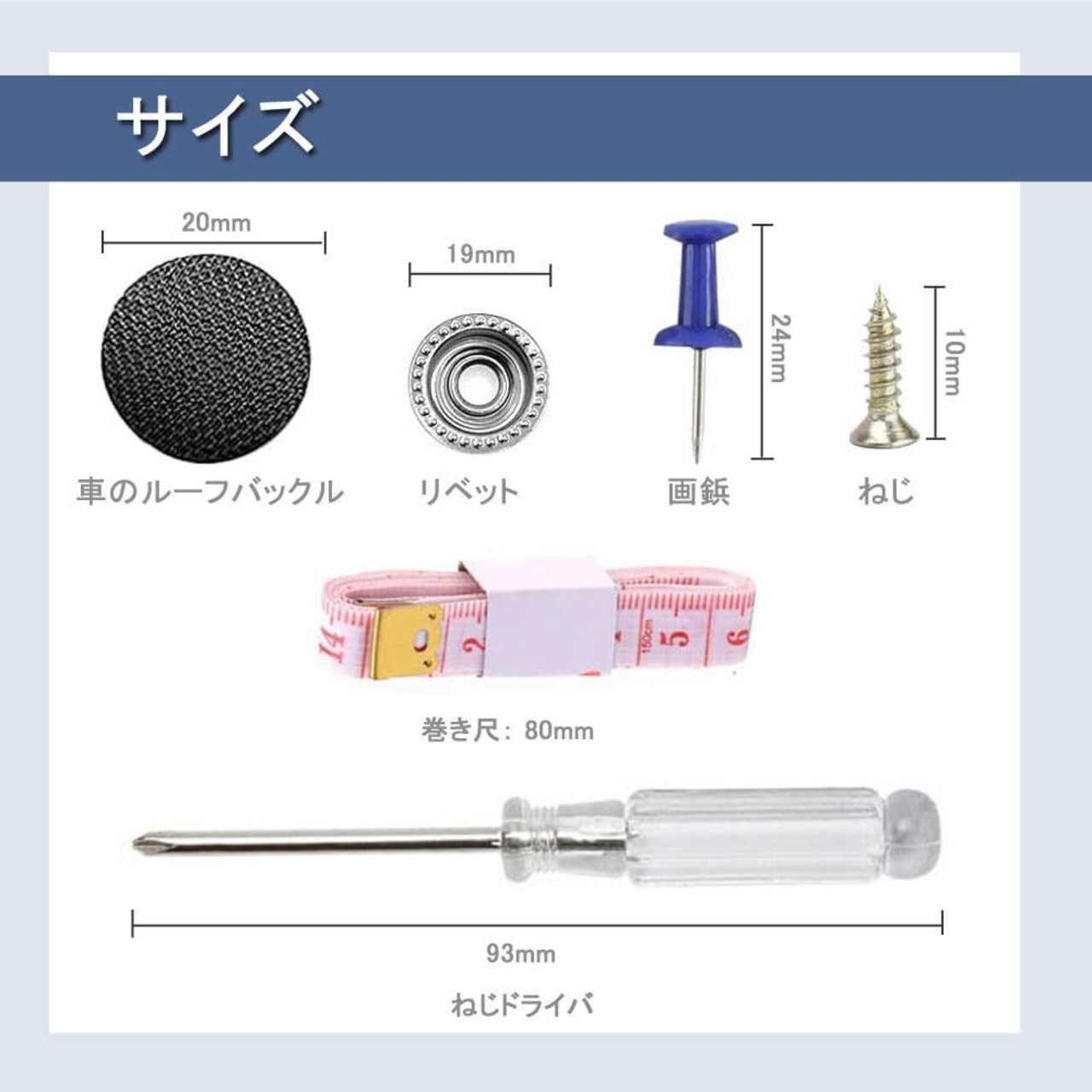 【セット内容】車のルーフバックル*60個、画鋲*30個、リベット*60個、十字ネジ*60個、ドライバー*1個、ソフト定規*1本。