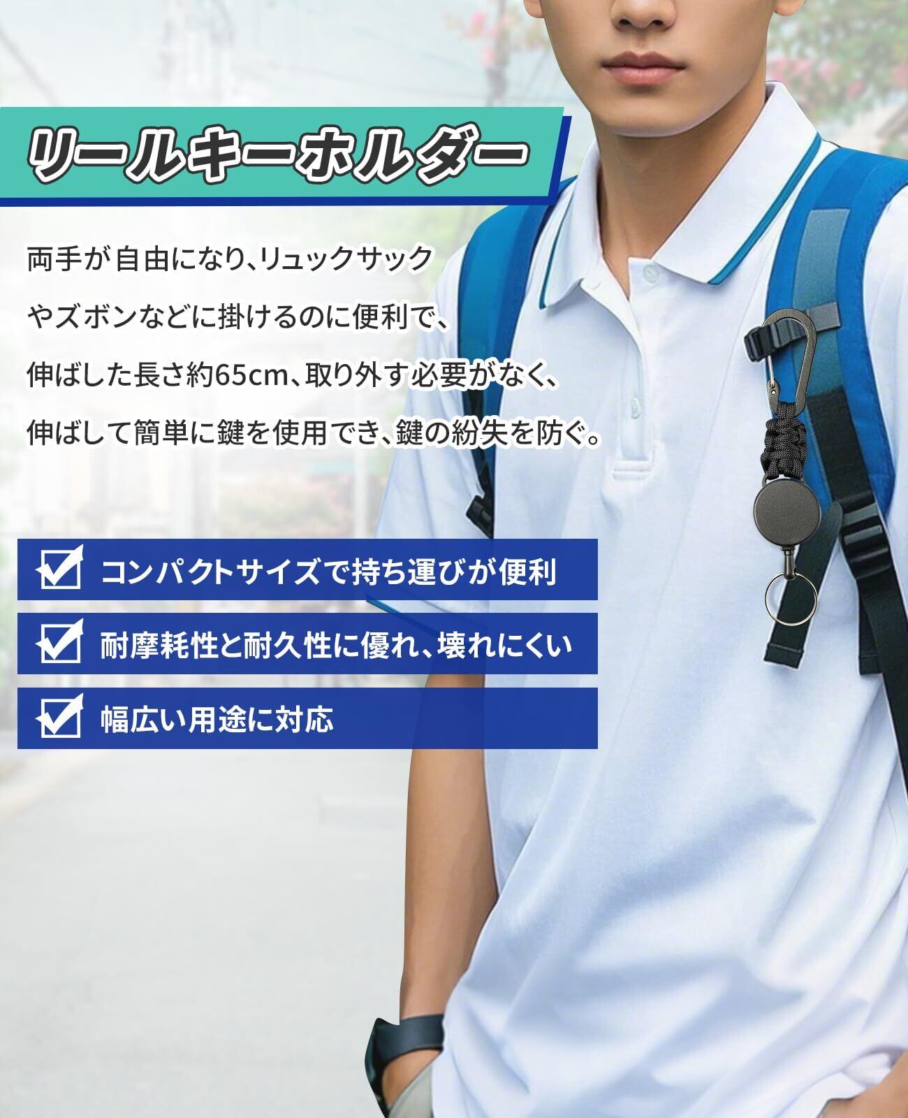 【商品仕様】リールストラップは2個セットになっております。長さは約15cm(平置き)。重さは約30グラム(2本)。直径1mmのスチールワイヤーロープを内蔵しており、最大約65cmまで巻き取り可能。バックパックやその他のアイテムに簡単に取り付けて、簡単に吊るすことができます。