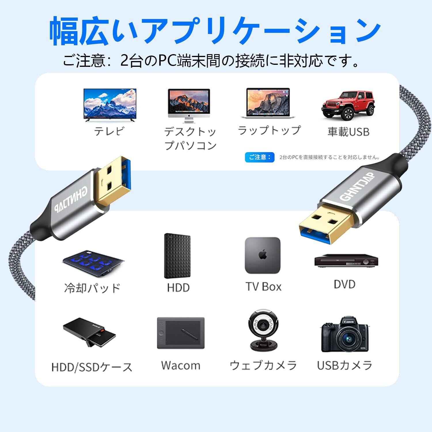 【幅広い互換性】USB Aコネクタのパソコンと、USB機器(USB Aコネクタを持つ機種)を接続するUSB オスオス ケーブルです。USBケーブルは、タイプAポートを備えたハードドライブエンクロージャ、およびタイプAポートを備えたラップトップ、冷却パッド、スマートTV、車内USB、DVDプレーヤー、USBハブ、モニター、カメラ、ブルーレイドライブ、セットトップボックス、外付けハードドライブなどと互換性があります。