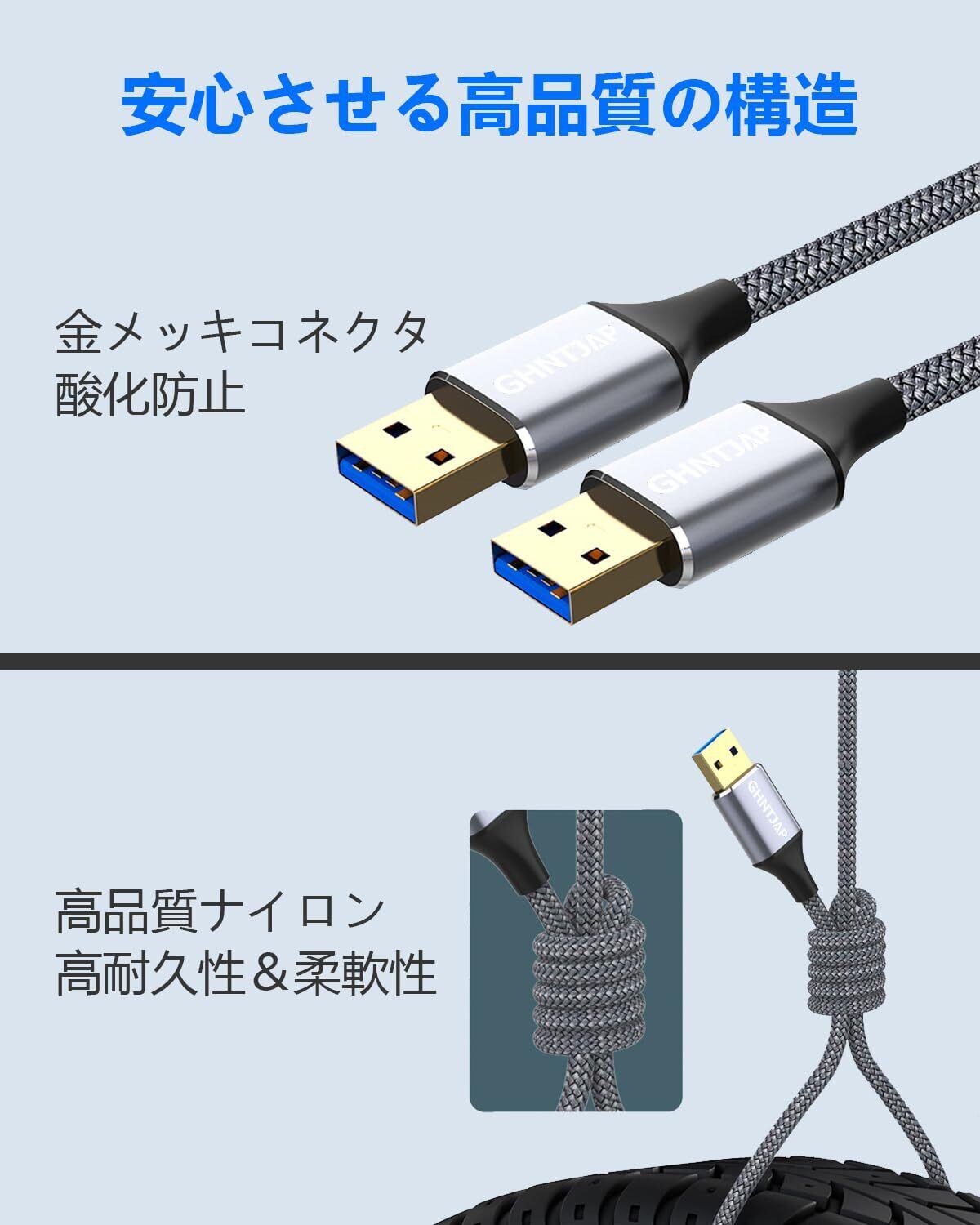 【高耐久性ナイロン編み】高品質ナイロンによるUSBコードの柔軟性が良くて耐久性も抜群です。このusbケーブル a-aタイプは10,000回以上の折り曲げテストでも断線しません。長年に経ってもケーブルの曲げ損傷が防止され、耐久性を強くなります。