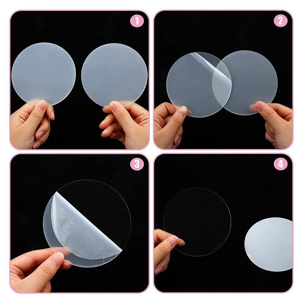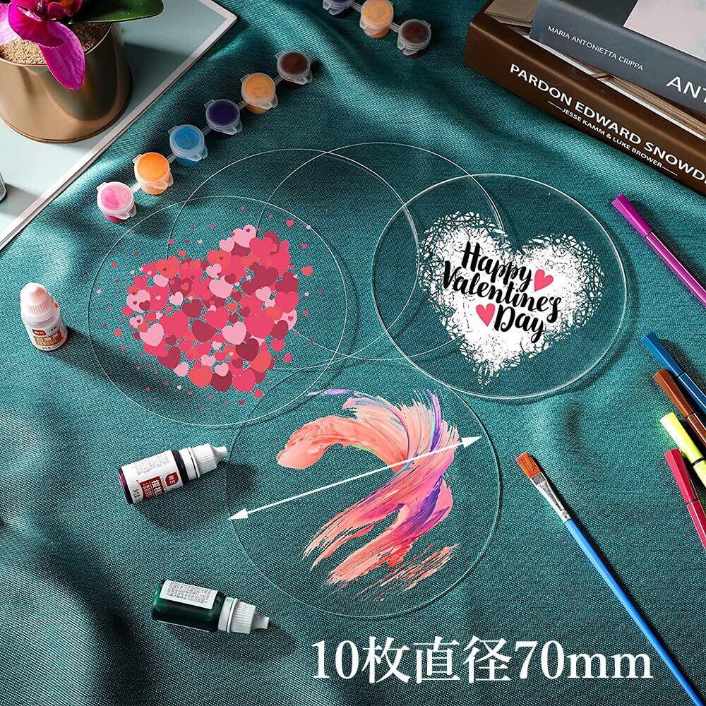 【商品仕様】パッケージ内容:丸型アクリル板10枚入り サイズ:直径約70mm、厚さ3mm。