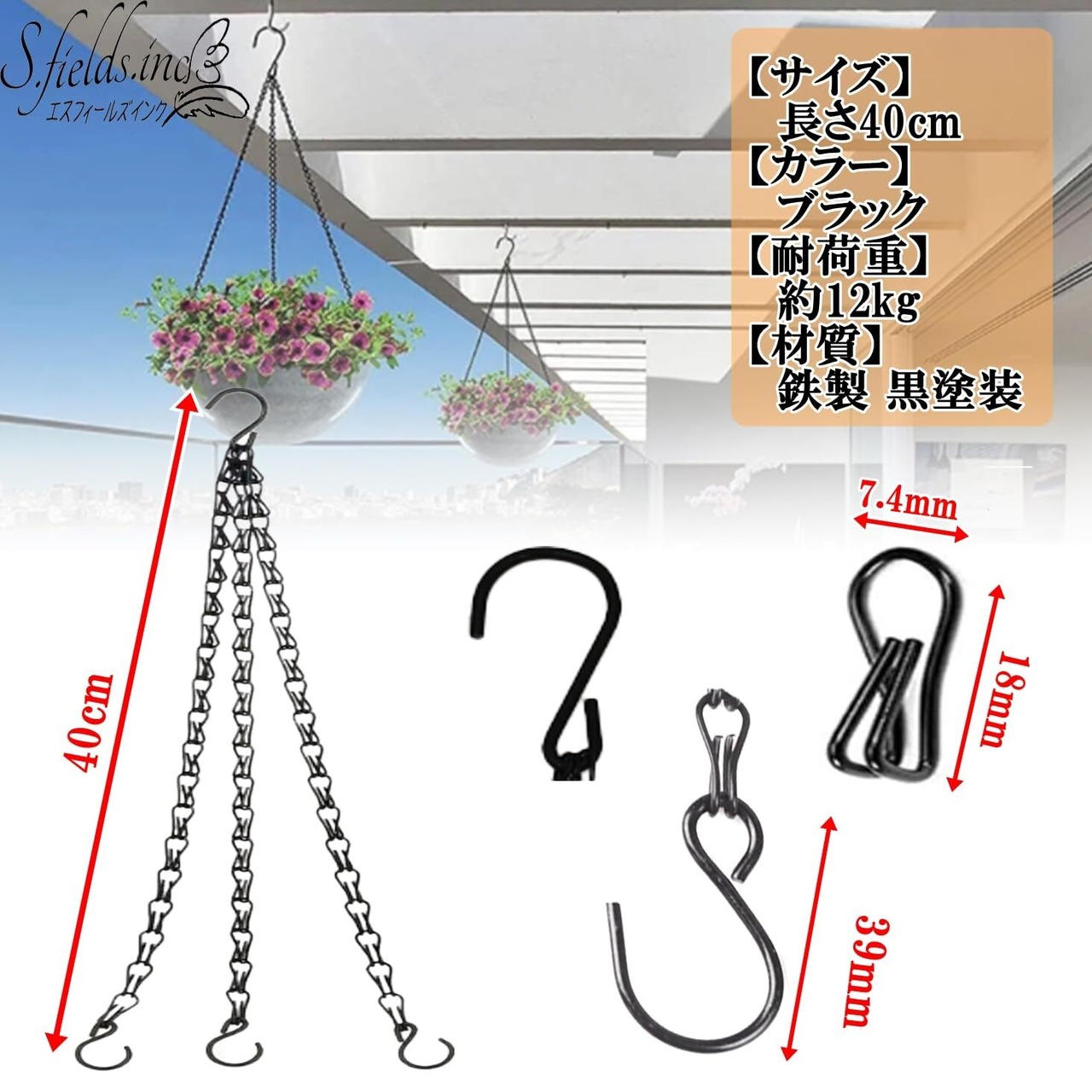 S.fields.inc プランターチェーン 吊り下げS字フック 3本セット 吊り鉢 ハンギングバスケット 鉄製