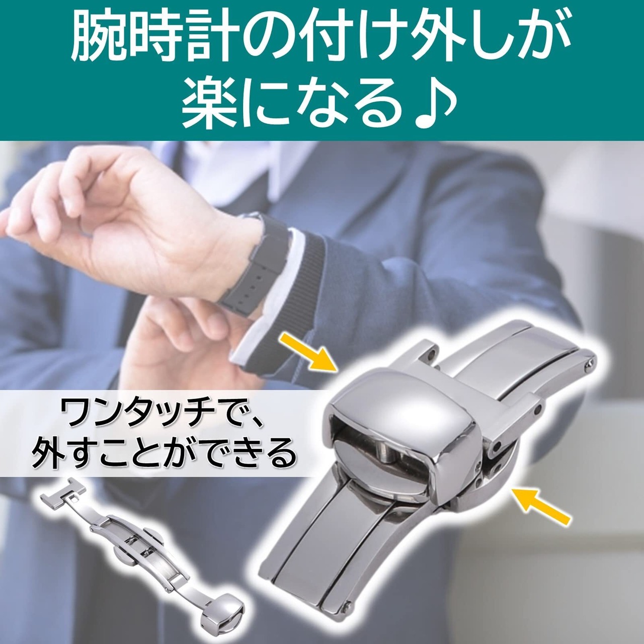 ダブルフォールディング式のDバックル。ワンプッシュ式で腕時計の付け外しが楽になります。