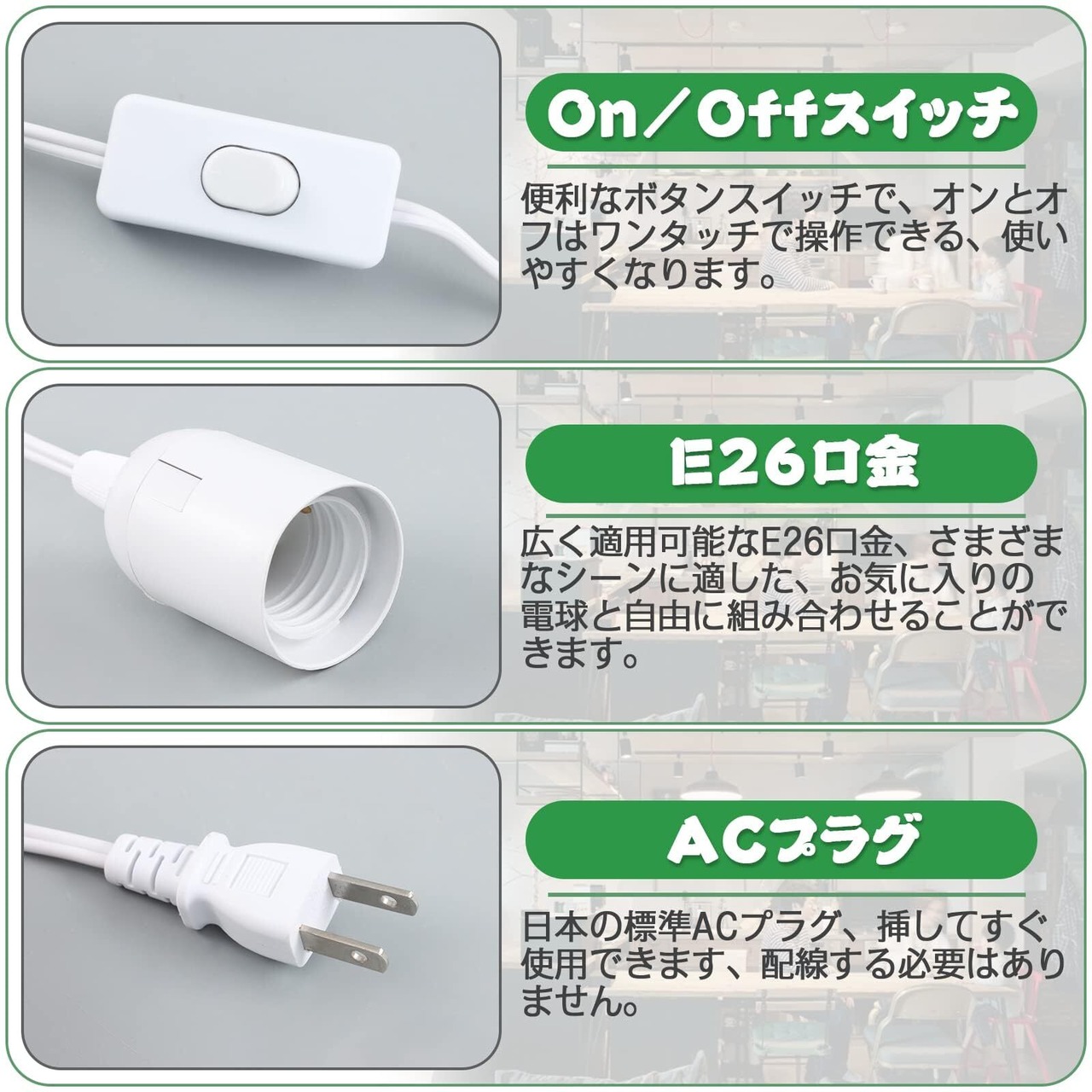 3.工事不要:コンセント式なスイッチ付きのペンダントライトなので、工事不要ですぐに使えます。