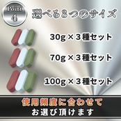 ・内容量:各30g(23mm x 15mm x 60mm)、70g(28mm x 20mm x 75mm)、100g(30mm x 25mm x 100mm)