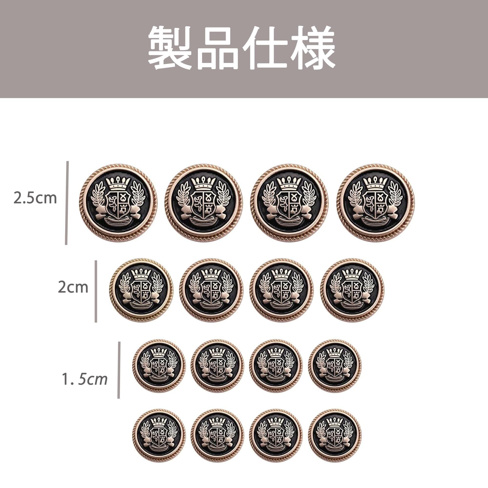 【製品仕様】本セットには16個の異なるサイズのスーツジャケット用ボタンが含まれており 具体的には8個の15mmボタン 4個の20mmボタン 4個の25mmボタンです 金 ボタン クラウンパターンのデザインはファッション性と美しさを兼ね備え 豪華な印象を与えます