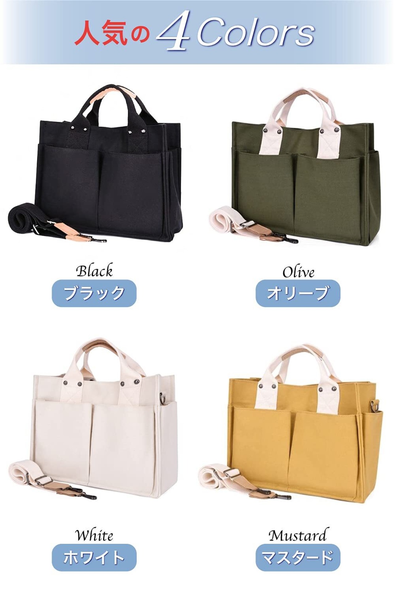 【こだわりの機能性とデザイン!】 : 容量がたっぷりあるキャンバス生地で作られ、耐久性にも優れています。複数のポケットを備えており、小物類もすぐに取り出せる設計です。また、ショルダーストラップ付きなので、ハンドバッグとしても、肩掛けバッグとしても楽しめます。毎日の生活シーンにぴったりのアイテムです。