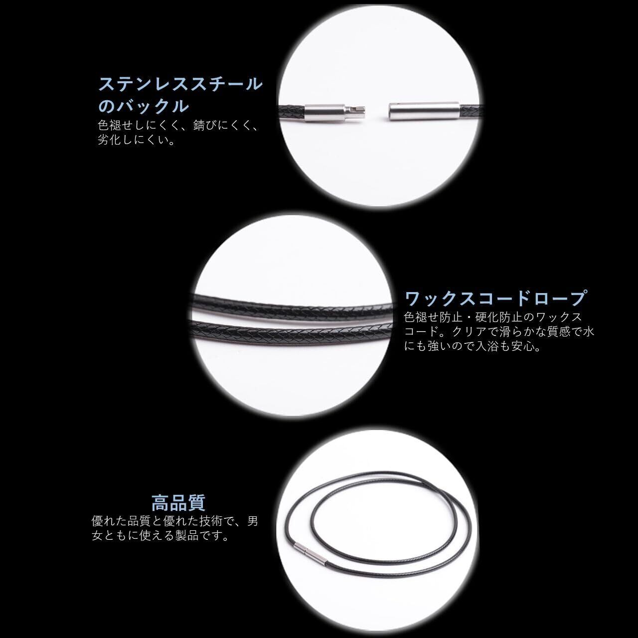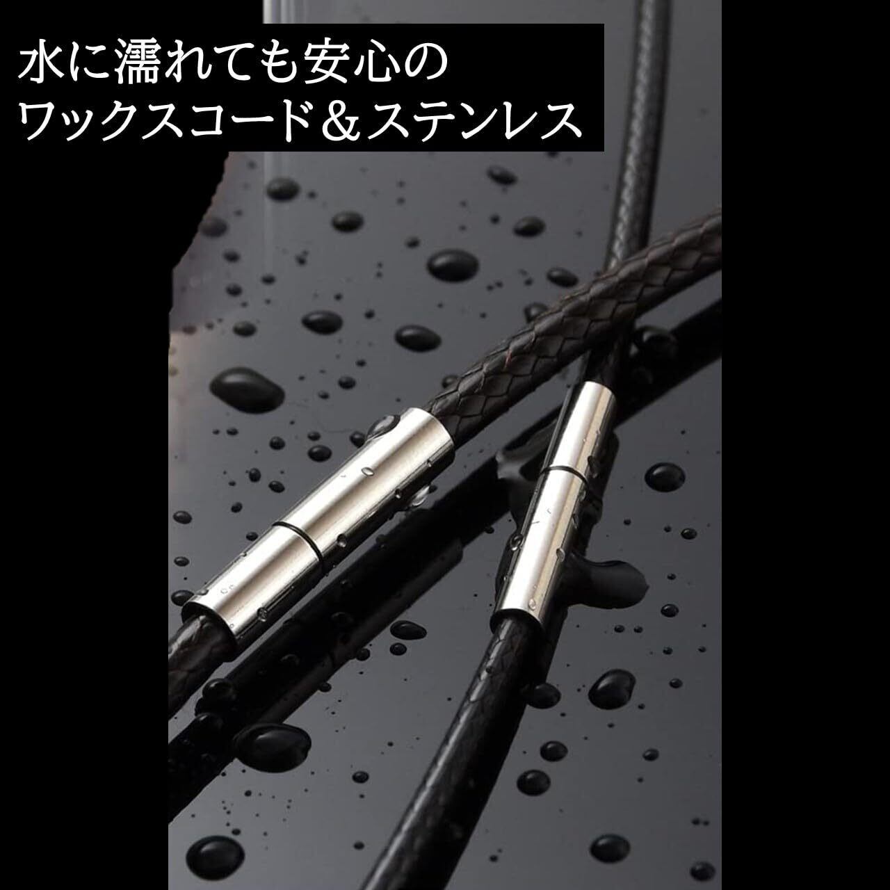 【ワックスコード】ネックレスの紐にはワックスコードを採用しています。ワックスコードとは蝋引き糸・ロウビキなどとも呼ばれるポリエステル素材にワックス加工した紐です。蝋を塗ることで耐久性が上がり、水にも強くなります。革やレザーより水や汗に強い素材で色落ちの心配もないので海やプール、お風呂やスポーツなど気にせず身に着けることができます。