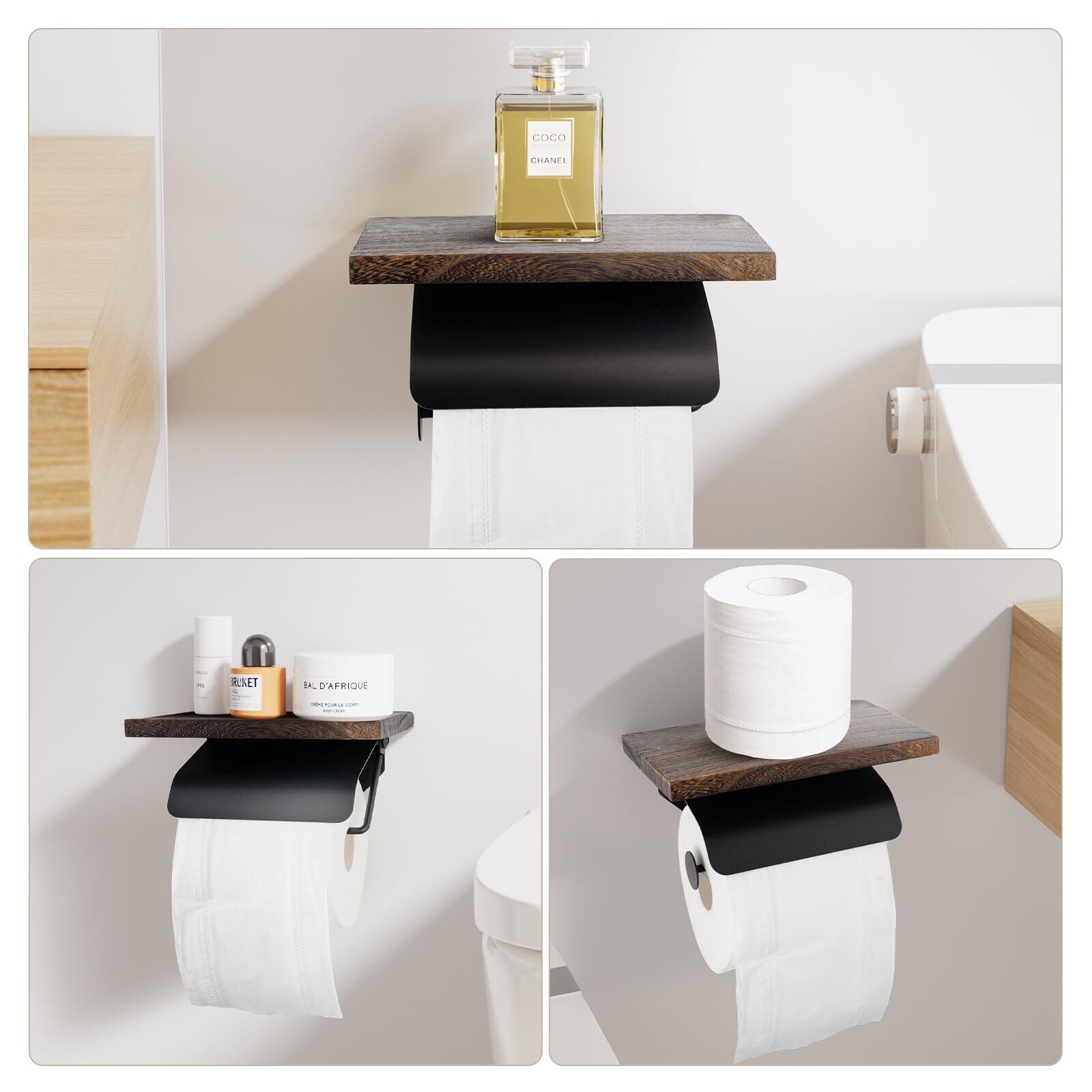 トイレットペーパーホルダー 木製 棚付き スマホ置き インテリア 賃貸 DIY おしゃれ 1連 簡単設置 補充楽 飾り棚 ペーパーホルダー 収納対応紙巻器(ブラウン×ブラック シングル) | hananoki