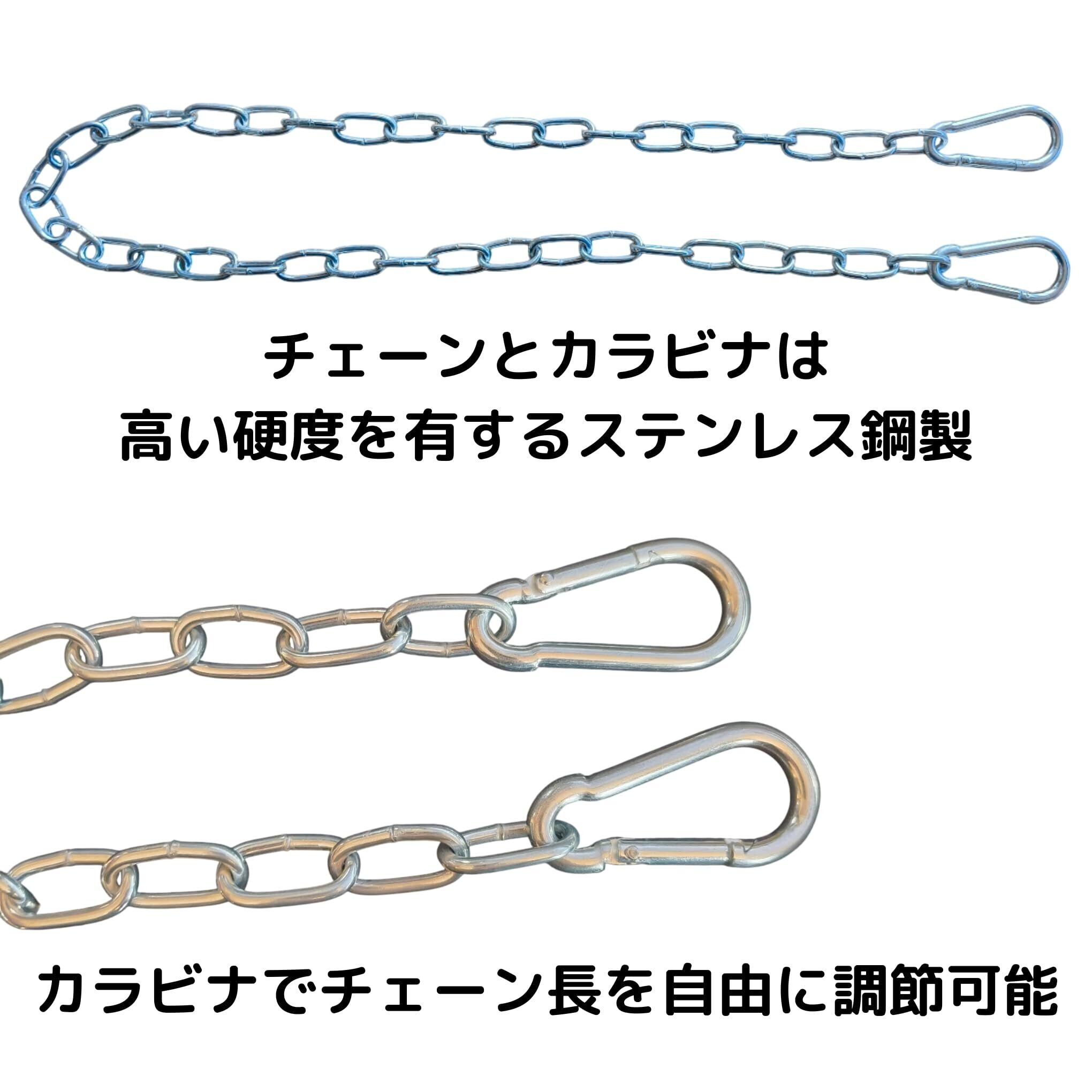 【負荷重量136kgまで】:チェーンとカラビナには高硬質ステンレス鋼を使用し、300ポンド(136kg)までのウェイトを装着できます。また、チェーンの長さはカラビナで自由に調節可能です。